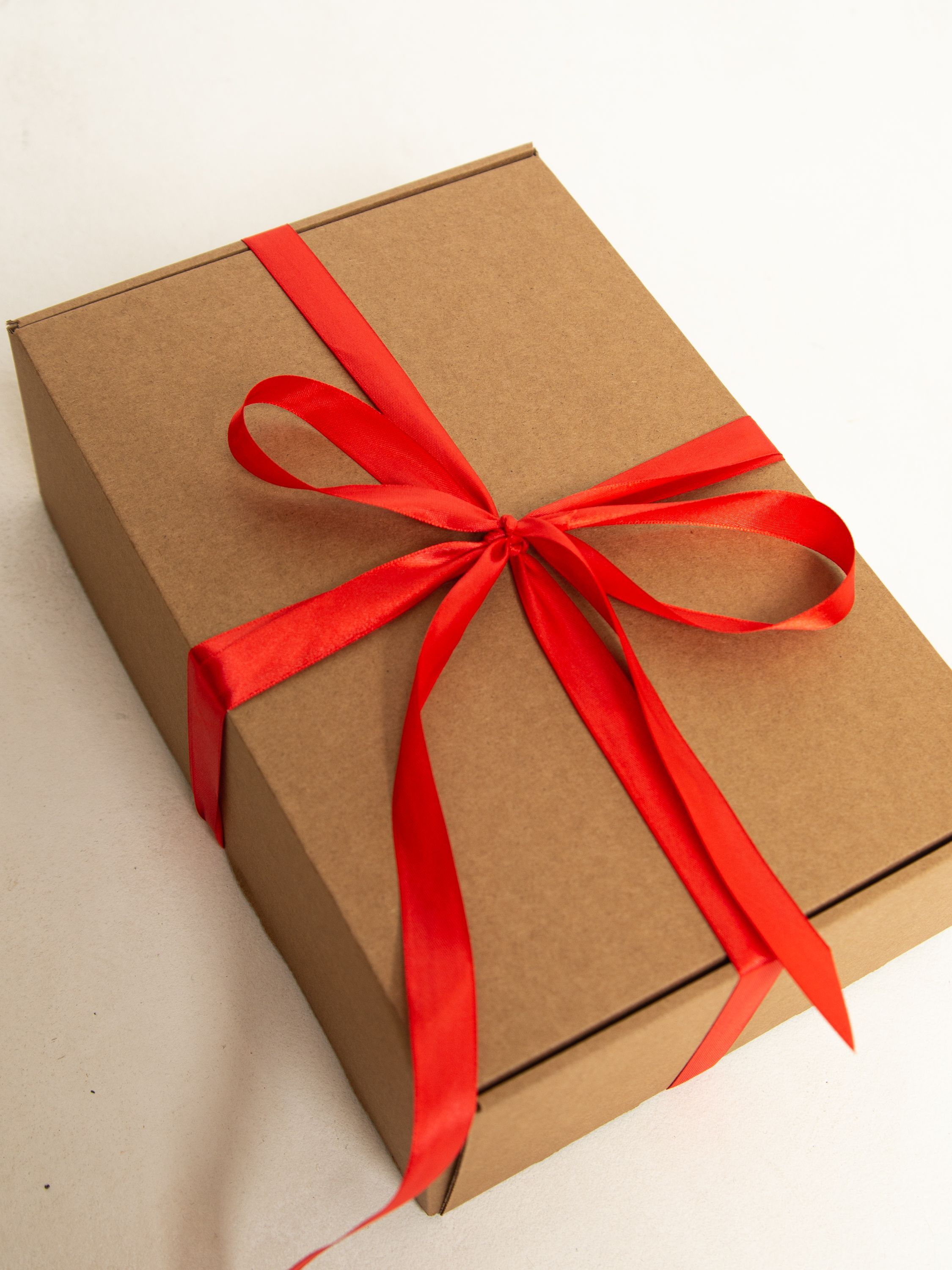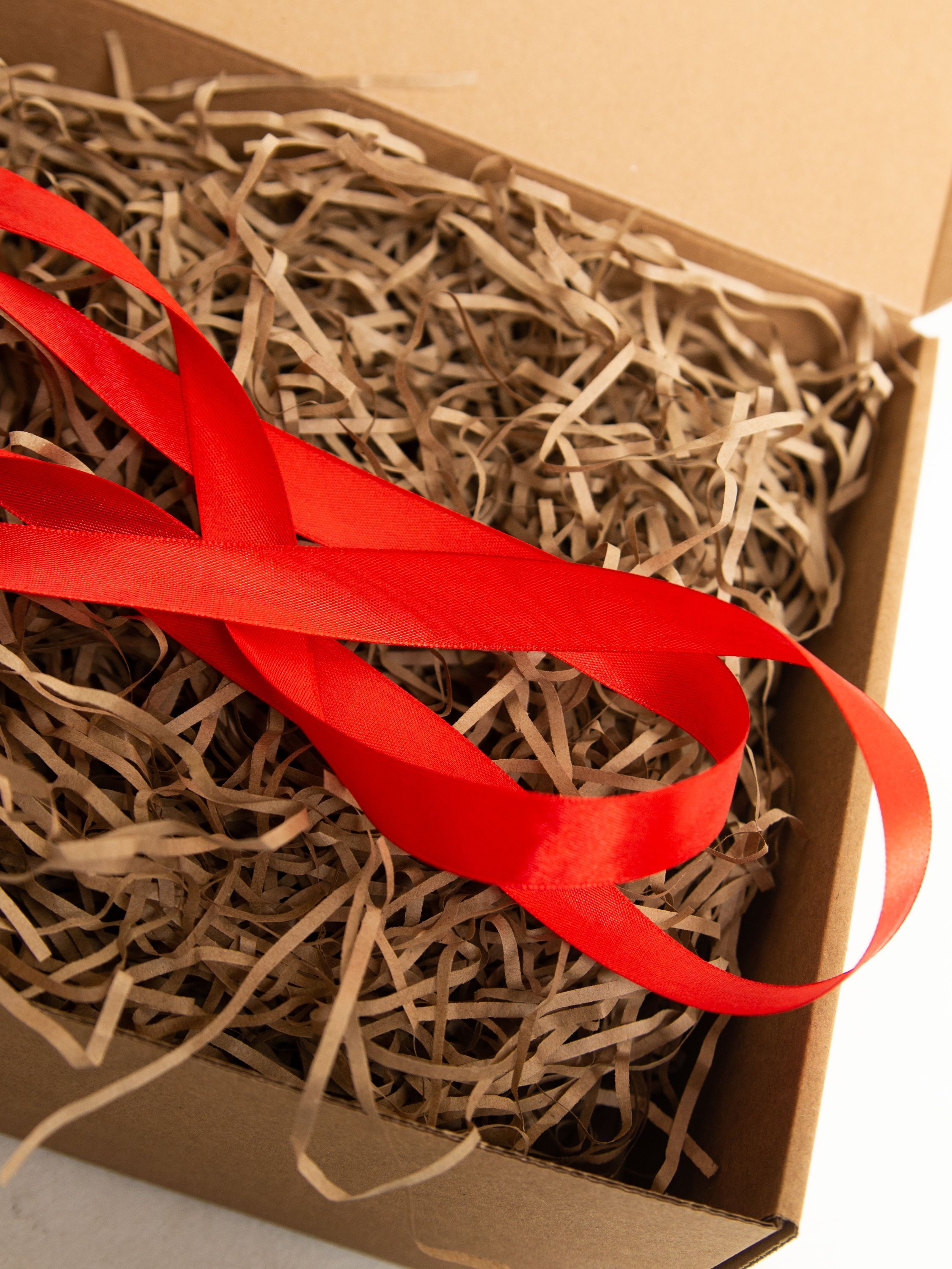 3 штуки - Подарочная коробка с наполнителем КРАФТ и красной лентой (32x22x10 см)