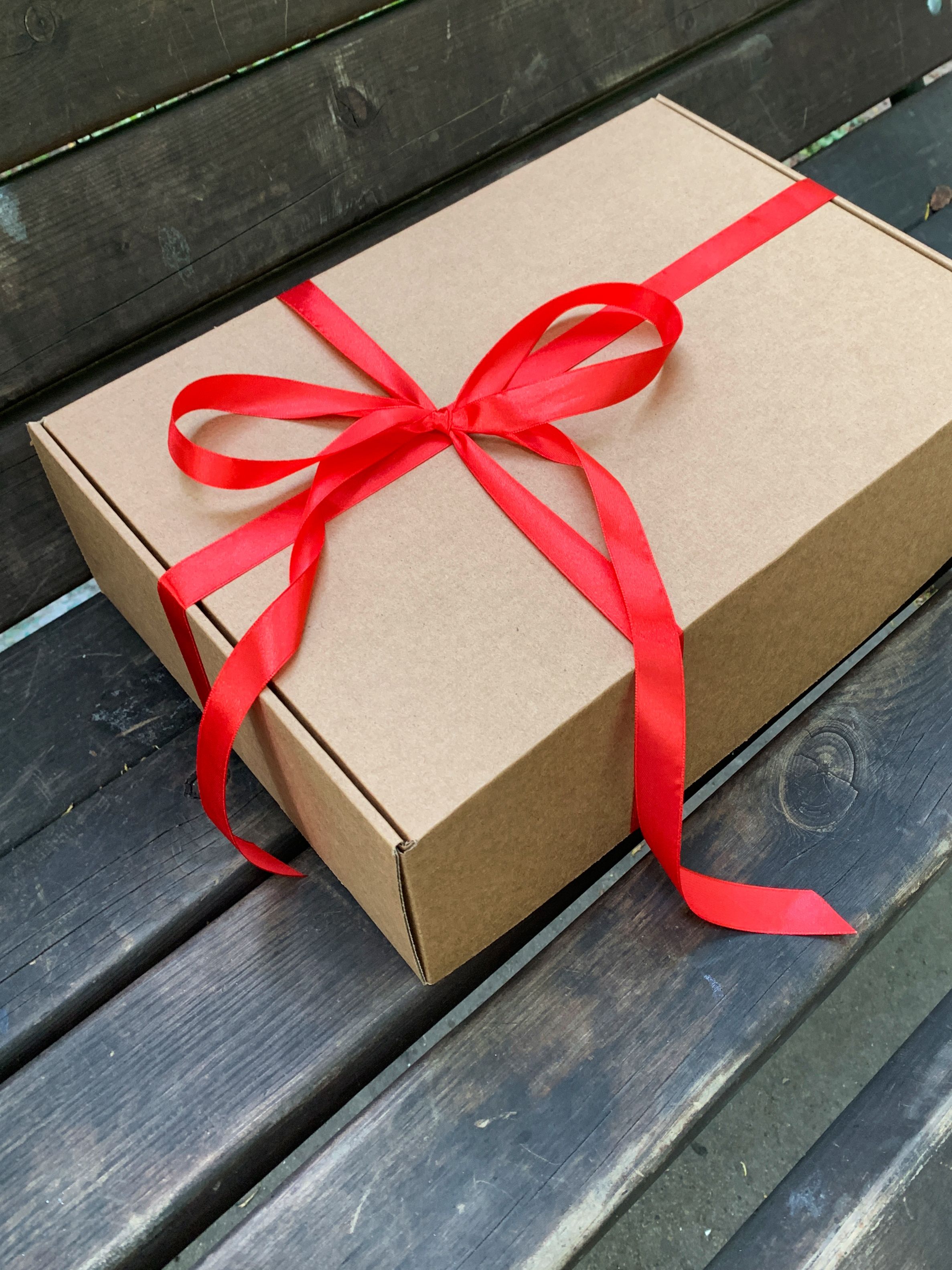 2 штуки - Подарочная коробка с наполнителем КРАФТ и красной лентой (37x26x12 см)