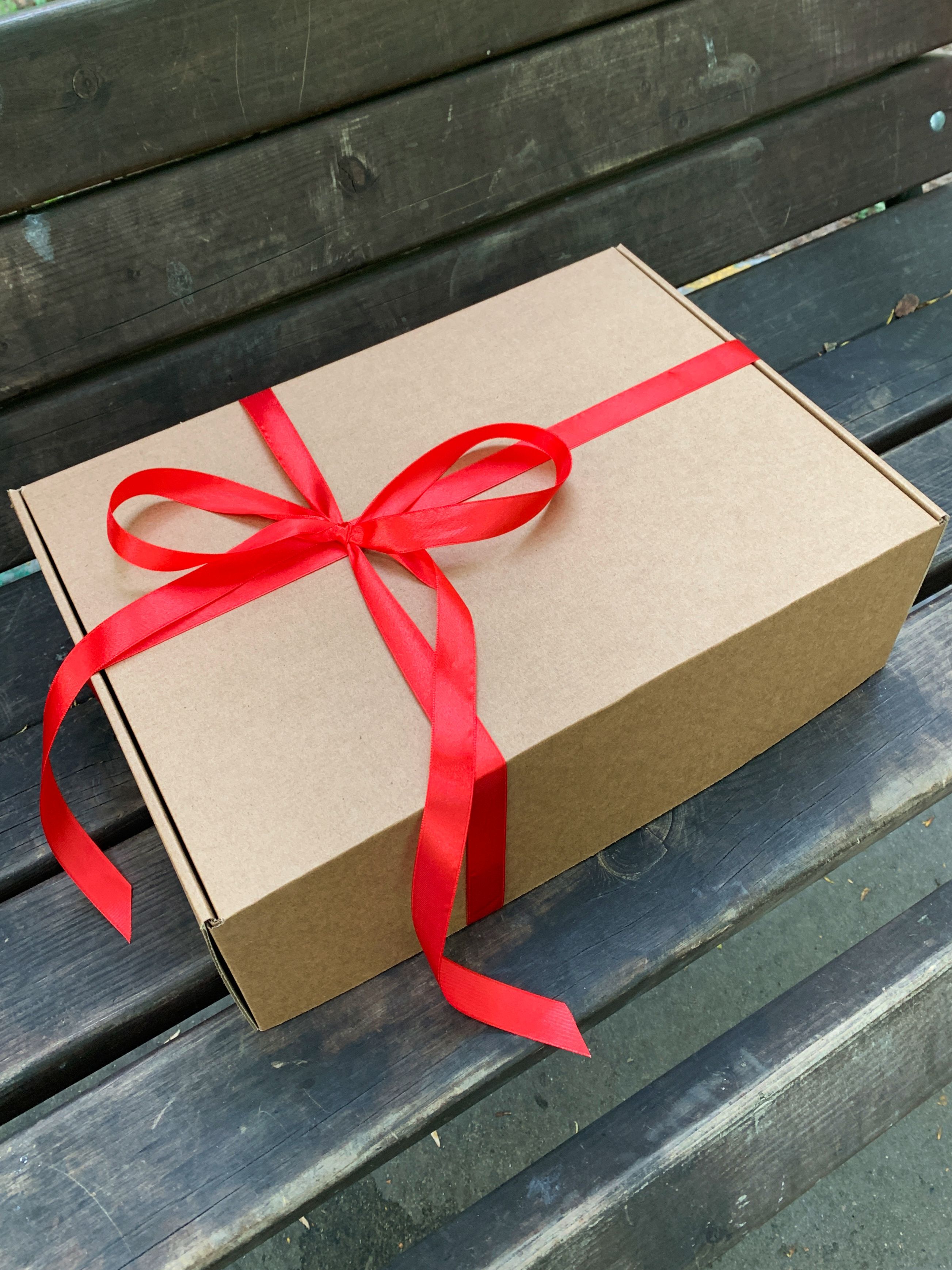 большая подарочная коробка 37х26х12 см с красной лентой и наполнителем - комплект 2 штуки Картонная коробка с бумажным наполнителем и атласной лентой – отличная упаковка для подарка. В крафтовой коробке презент будет смотреться стильно и лаконично. Подарочные коробки с красной атласной лентой оптимальны с точки зрения размера, например, в них идеально помещается бутылка вина или коньяка, небольшой подарок и лист А4, ещё остаётся место. Подарочные крафт-коробки также представлены и в других размерах: есть как совсем маленькие, так и большие подарочные коробки. Картонная коробка – стильный и экологичный способ упаковки подарка на любой праздник. Собрать подарочный набор и упаковать в уже готовую коробку с лентой и наполнителем – чем не вариант для подарка близкому человеку на любой праздник, например, день рождения, юбилей, 1 сентября, хеллоуин или день учителя. Комплектация: подарочная коробка 37х26х12см - 2 штуки, бумажный наполнитель, атласная лента - 2 штуки.