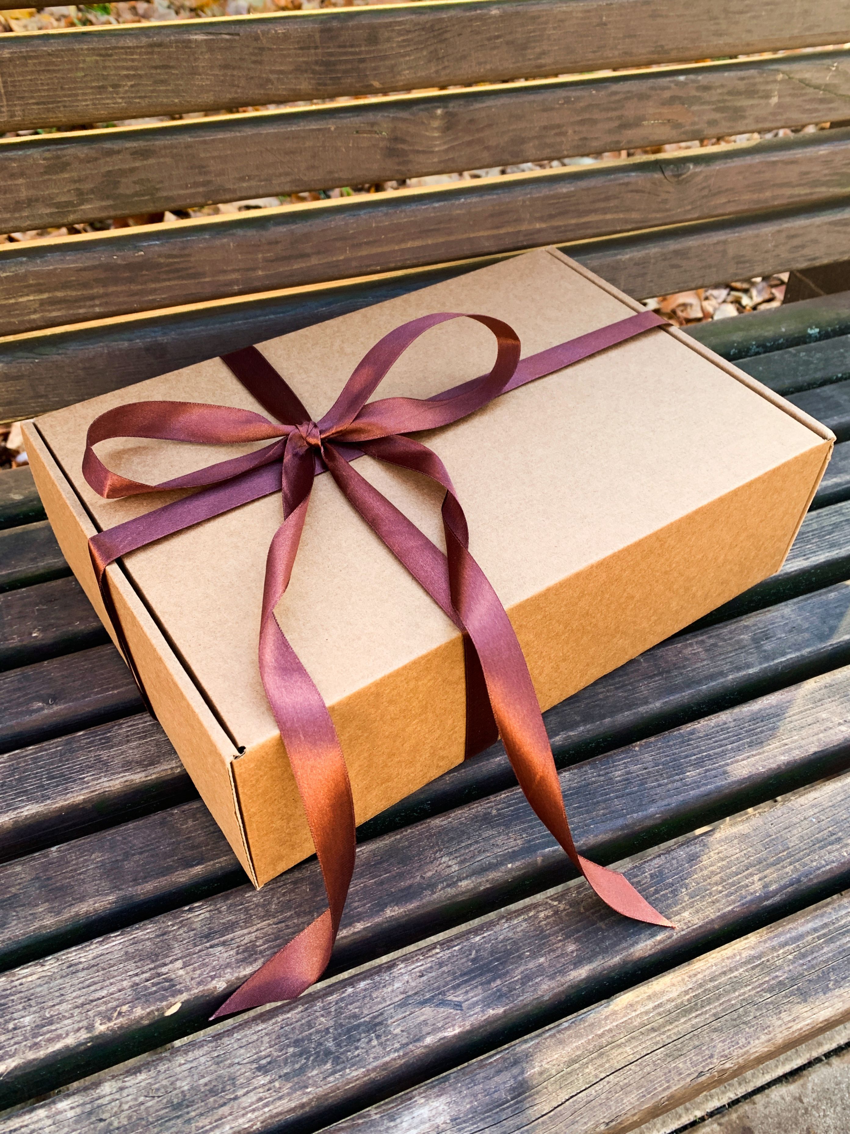 Подарочные коробки с коричневой атласной лентой оптимальны с точки зрения размера, например, в них идеально помещается бутылка вина или коньяка, небольшой подарок и лист А4. Подарочные крафт-коробки также представлены и в других размерах: есть как совсем маленькие, так и большие подарочные коробки. Картонная коробка – стильный и экологичный способ упаковки подарка на любой праздник. Собрать подарочный набор и упаковать в уже готовую коробку с лентой и наполнителем – чем не вариант для подарка близкому человеку на любой праздник, например, день рождения, юбилей, 1 сентября, хеллоуин или день учителя. Комплектация: подарочная коробка 32х22х10см - 2 штуки, бумажный наполнитель, атласная лента коричневого цвета - 2 штуки