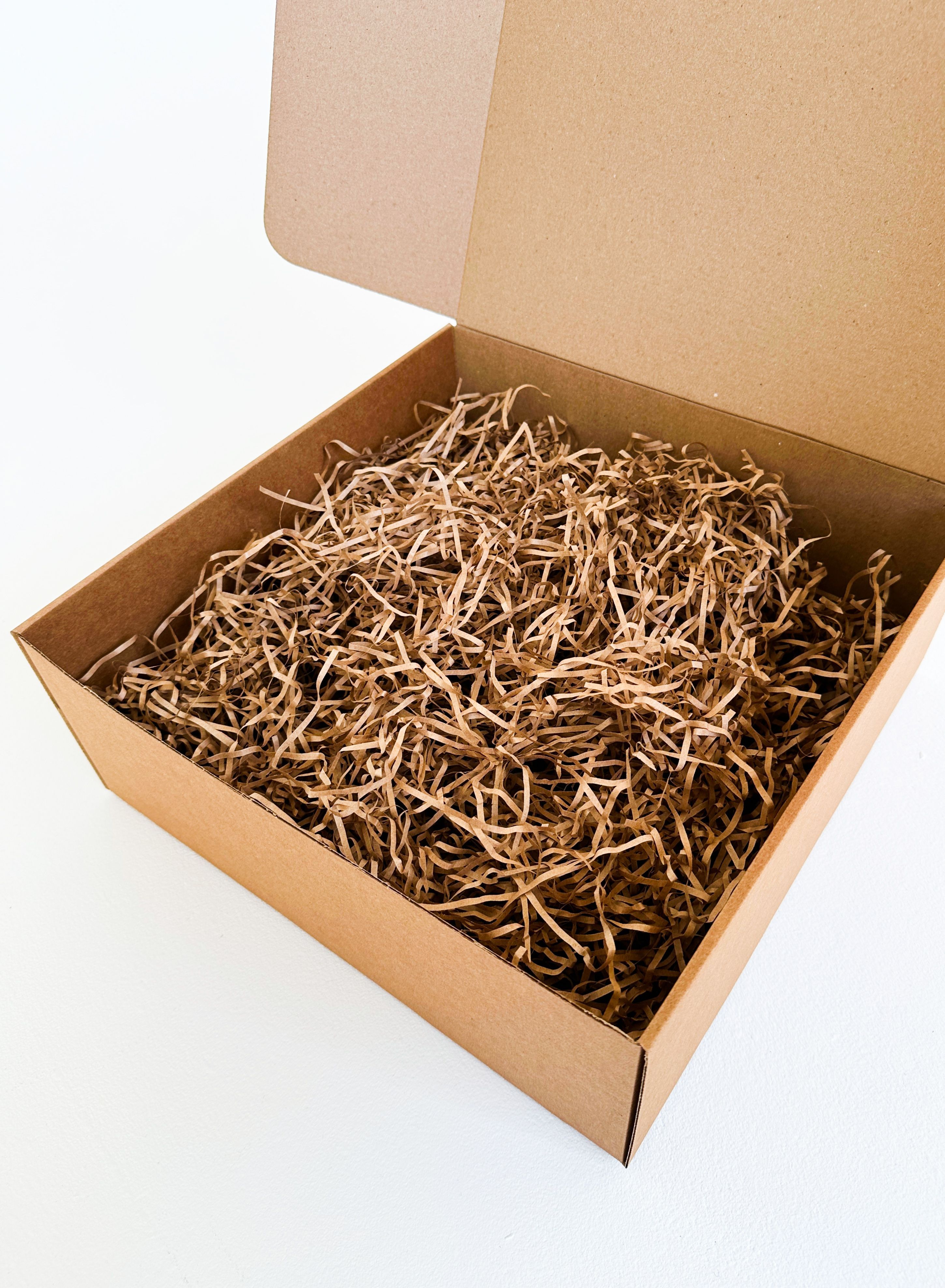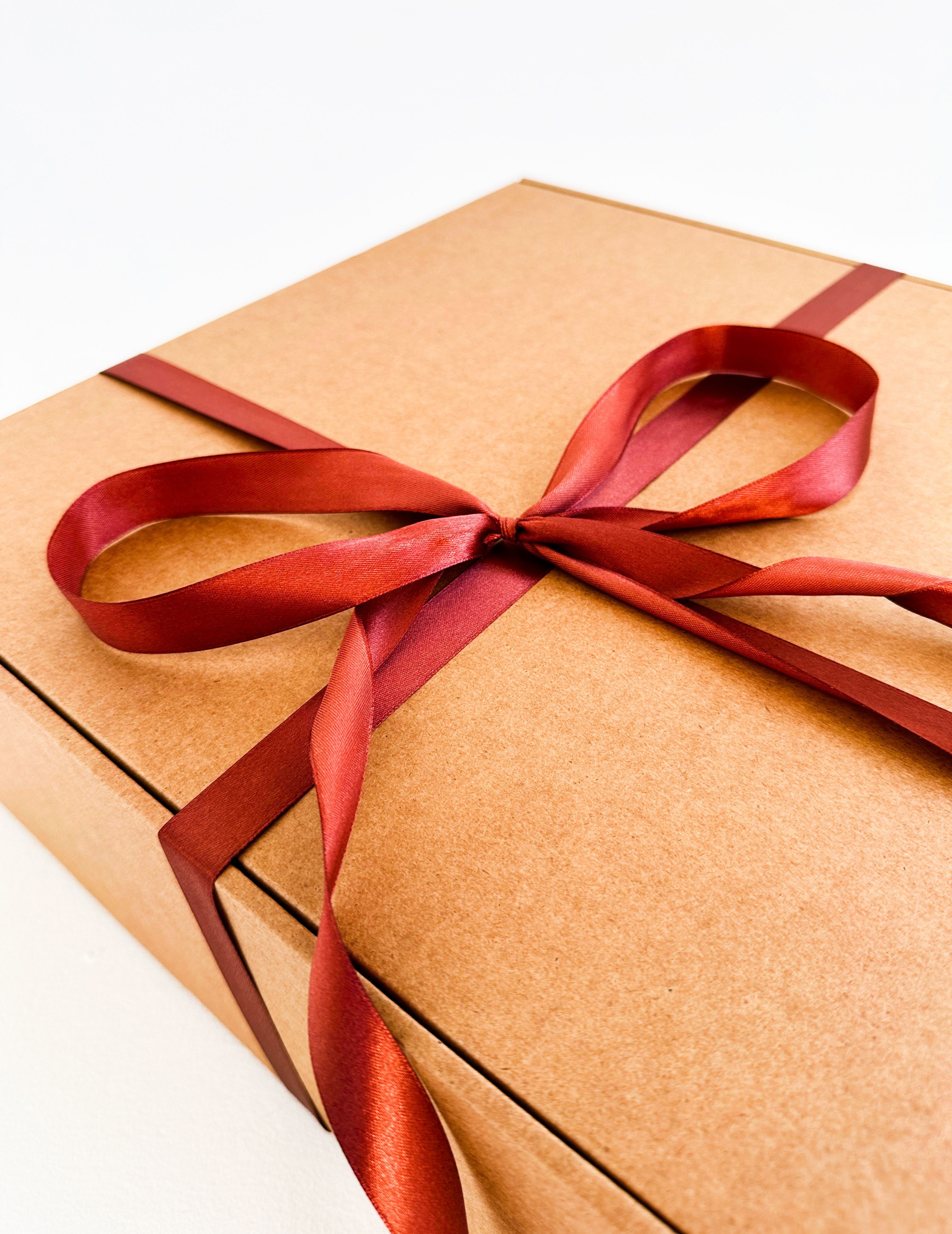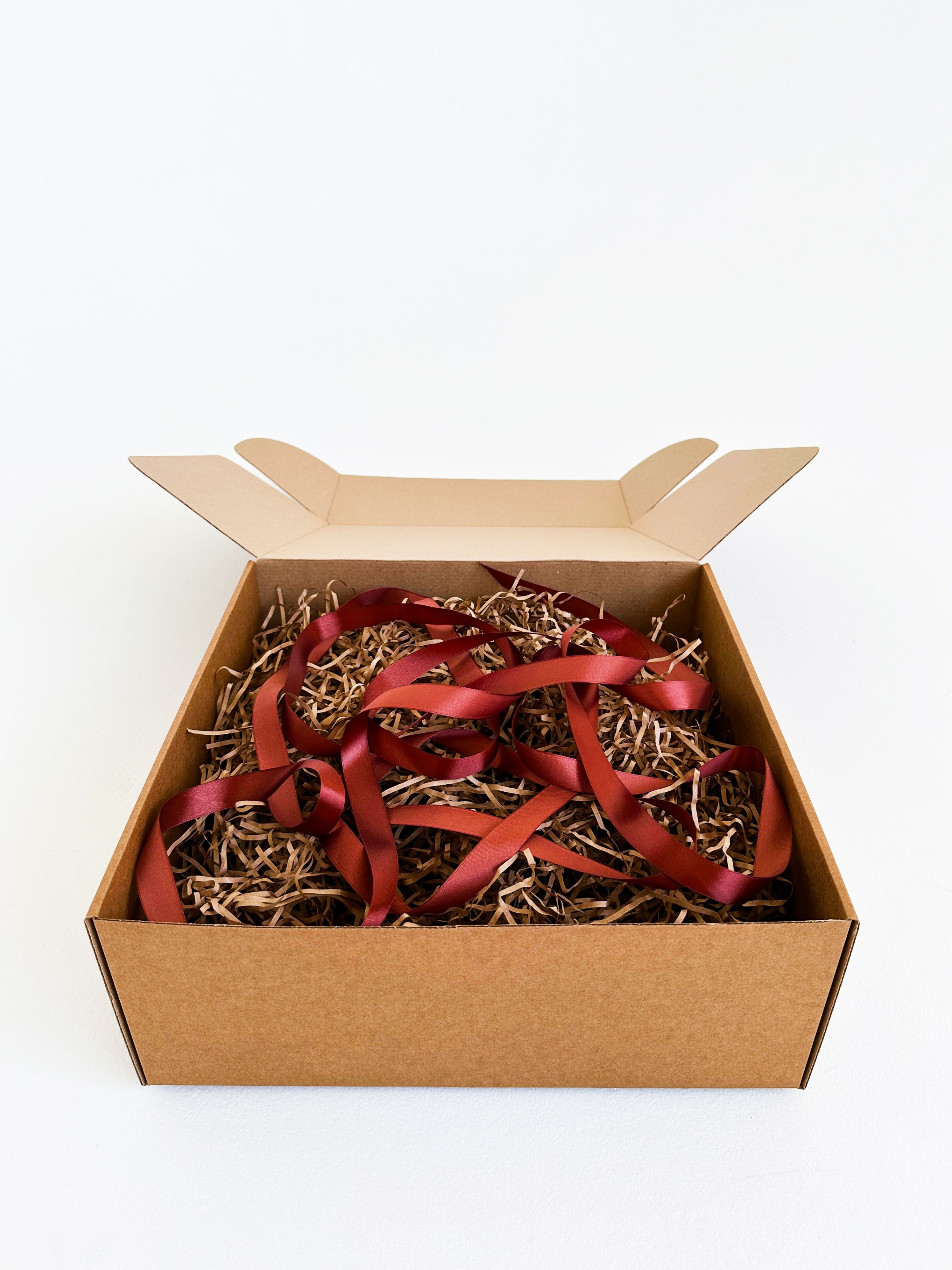 В комплекте с коробкой идёт бумажный наполнитель в цвете крафт, который придаёт упаковке особый шарм и элегантность. Также в комплекте есть коричневая атласная лента, которая добавляет изысканности и завершённости образу.