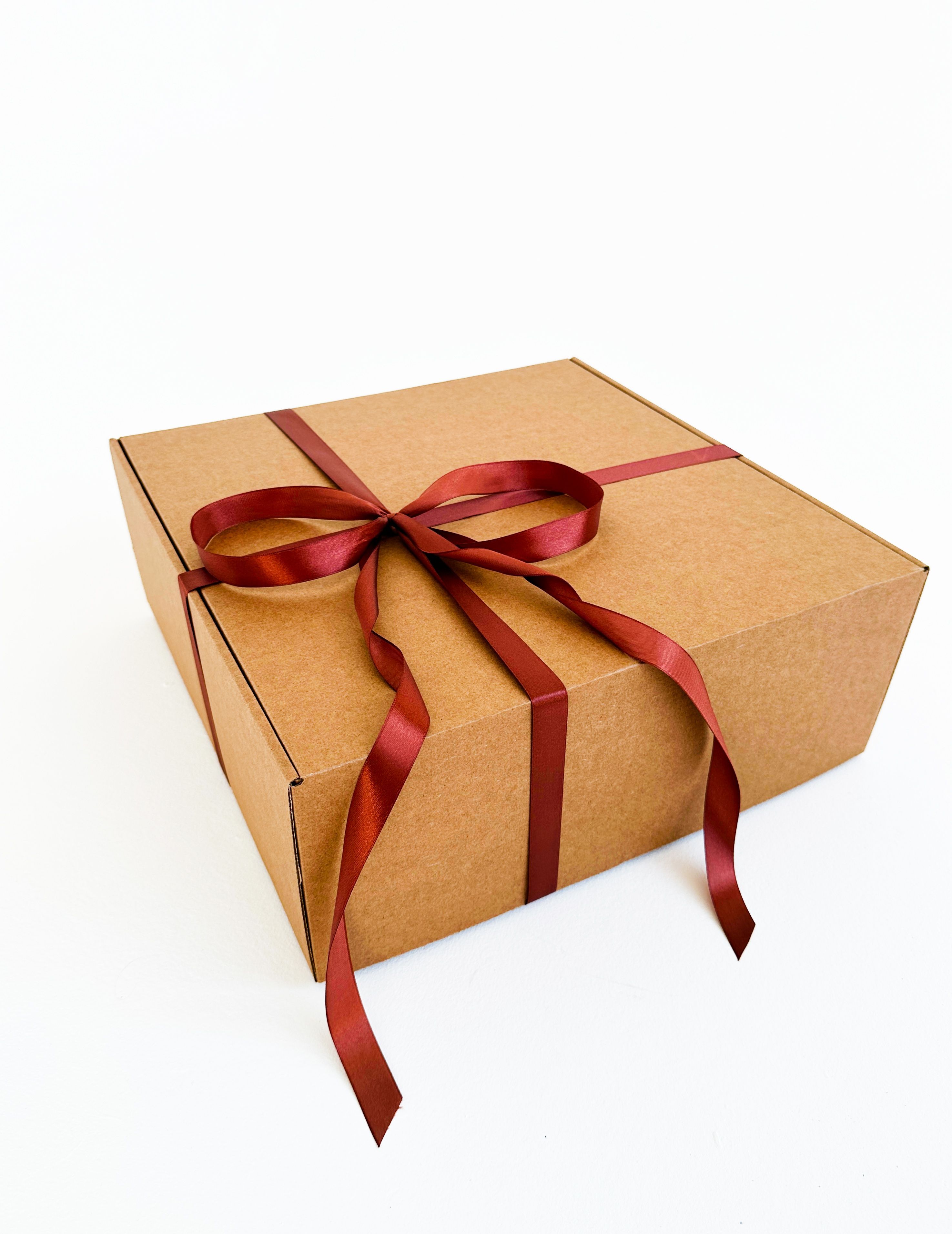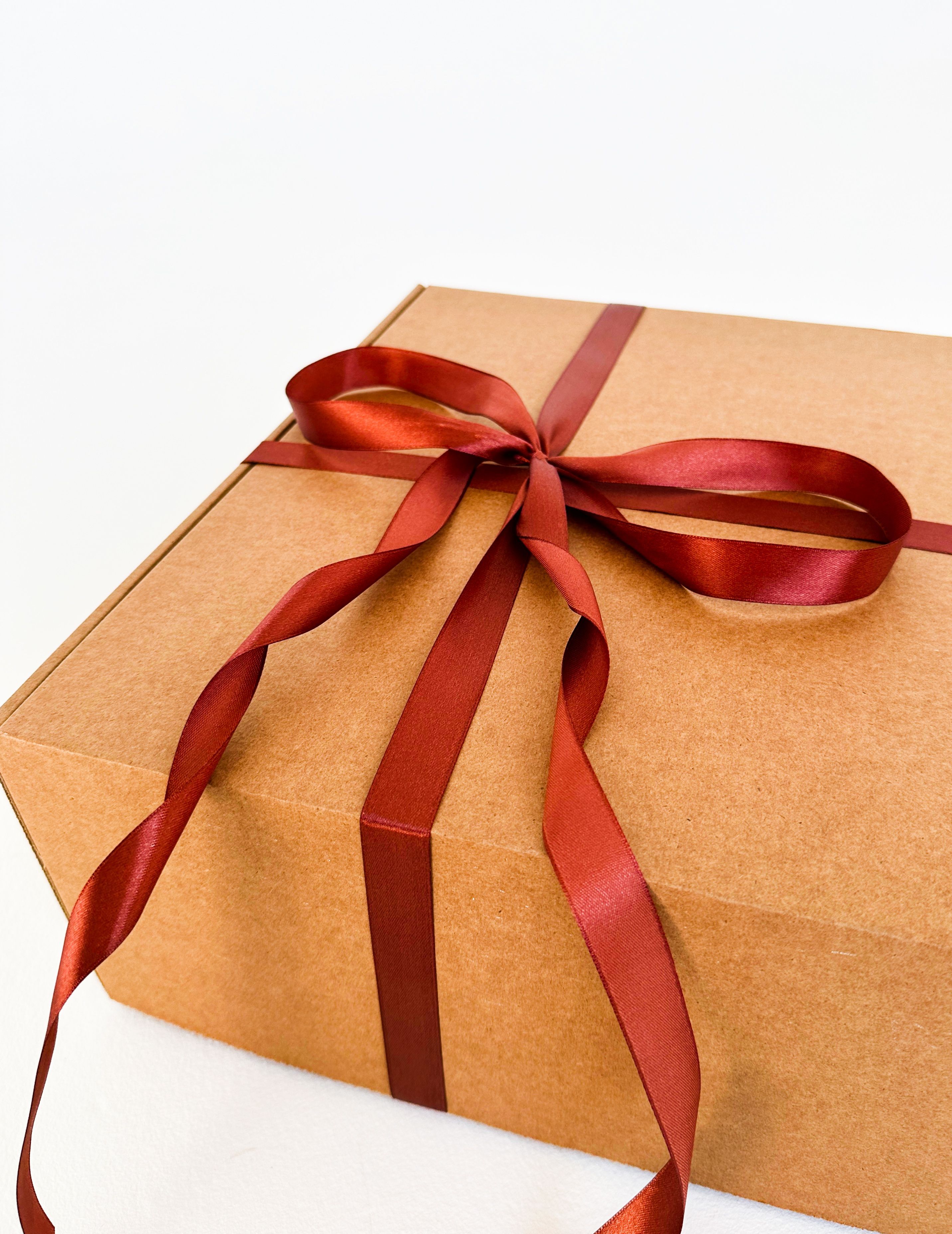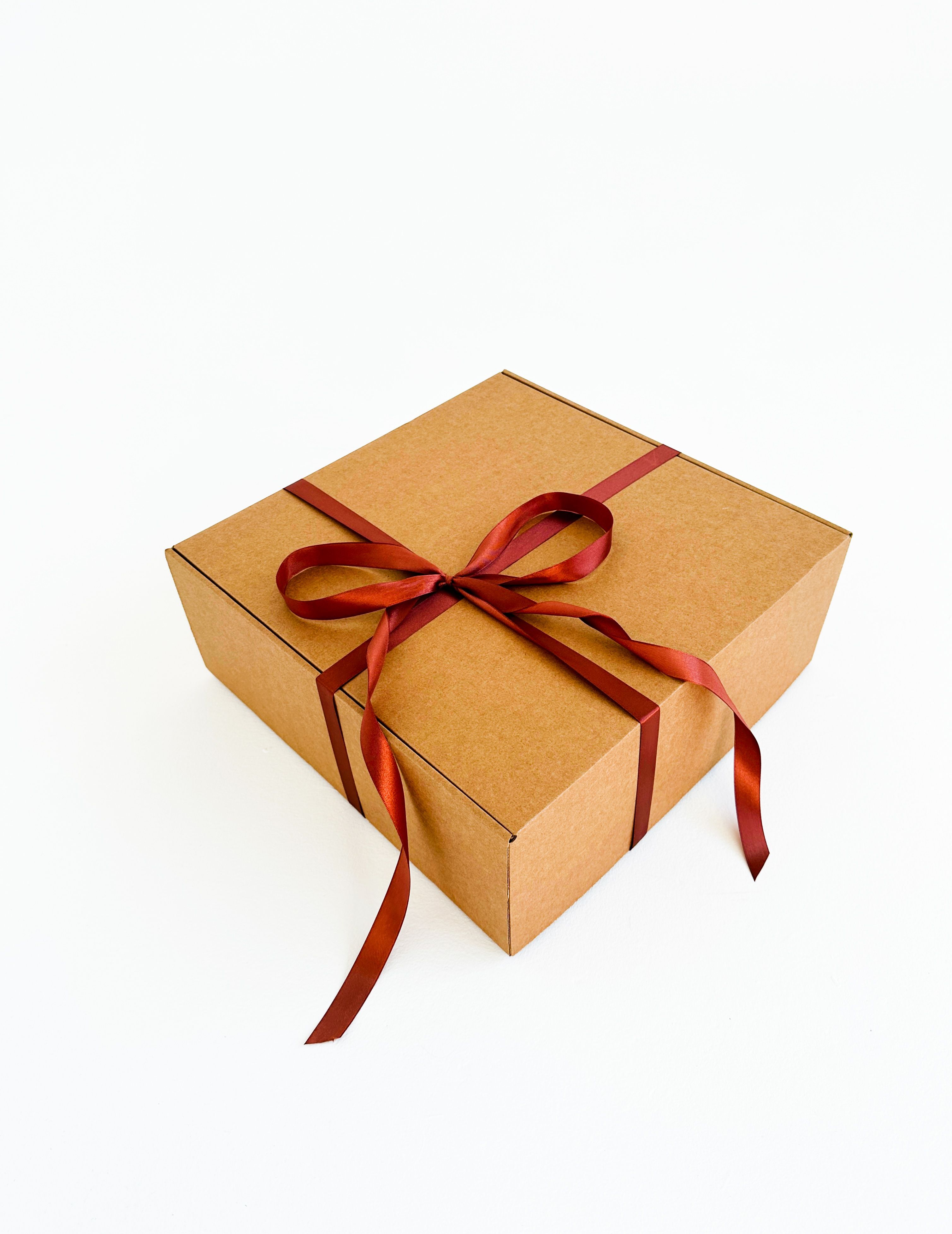 В комплекте с коробкой идёт бумажный наполнитель в цвете крафт, который придаёт упаковке особый шарм и элегантность. Также в комплекте есть коричневая атласная лента, которая добавляет изысканности и завершённости образу.