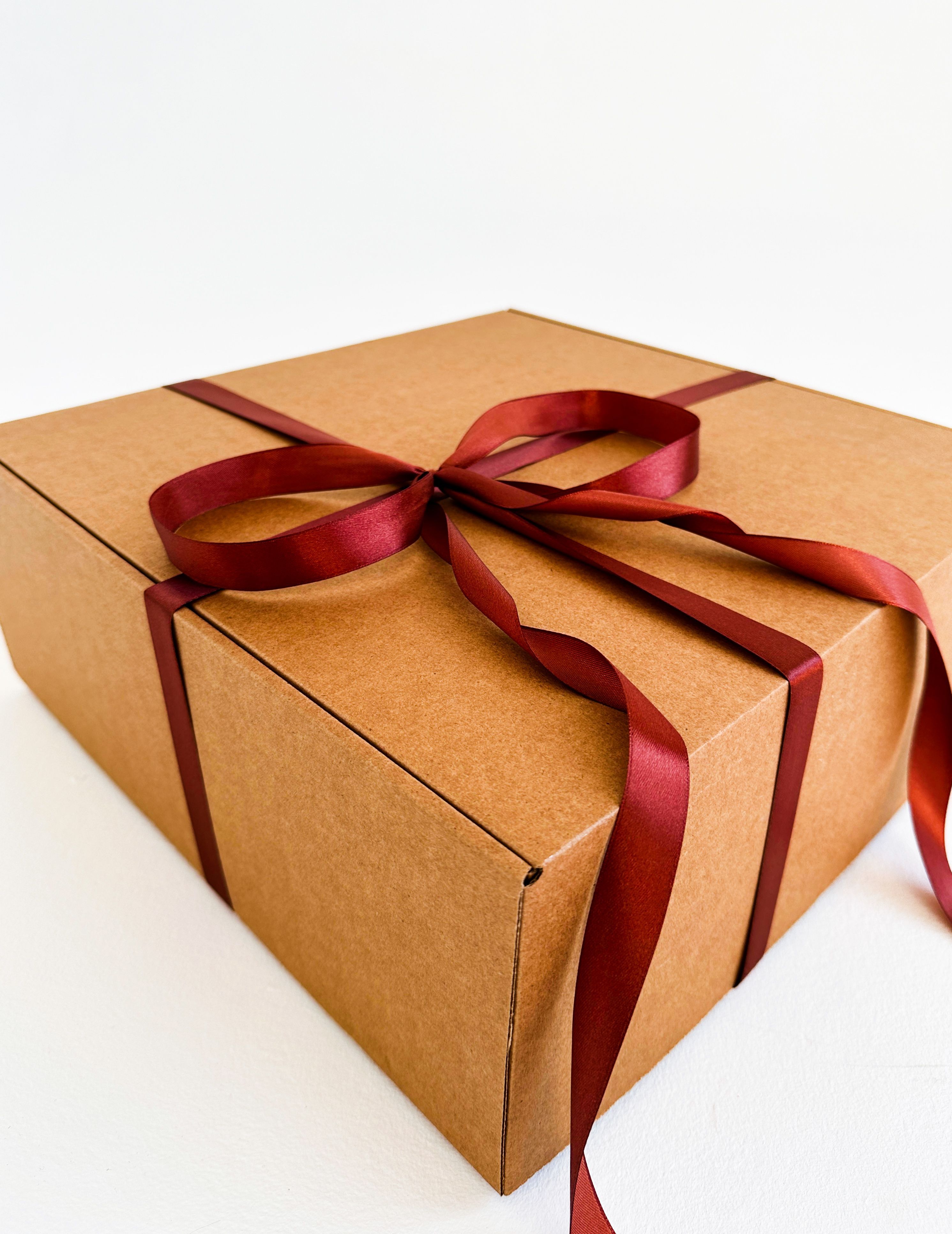 Большая подарочная коробка 37х37х14 см с бумажным наполнителем крафт и коричневой атласной лентой.