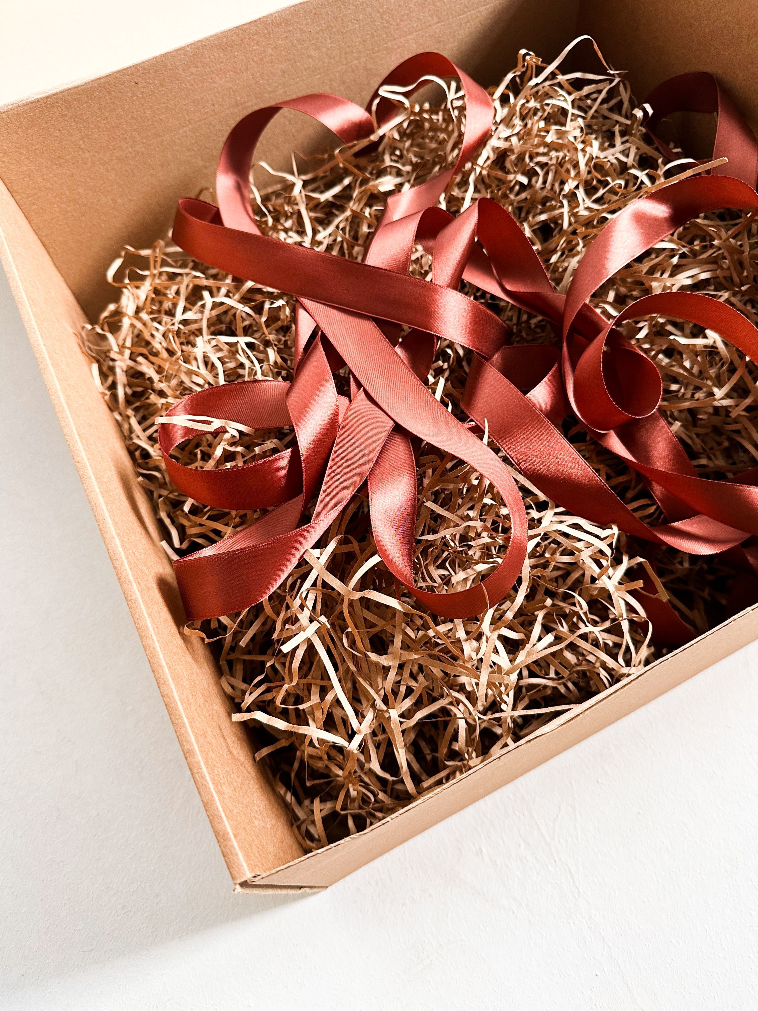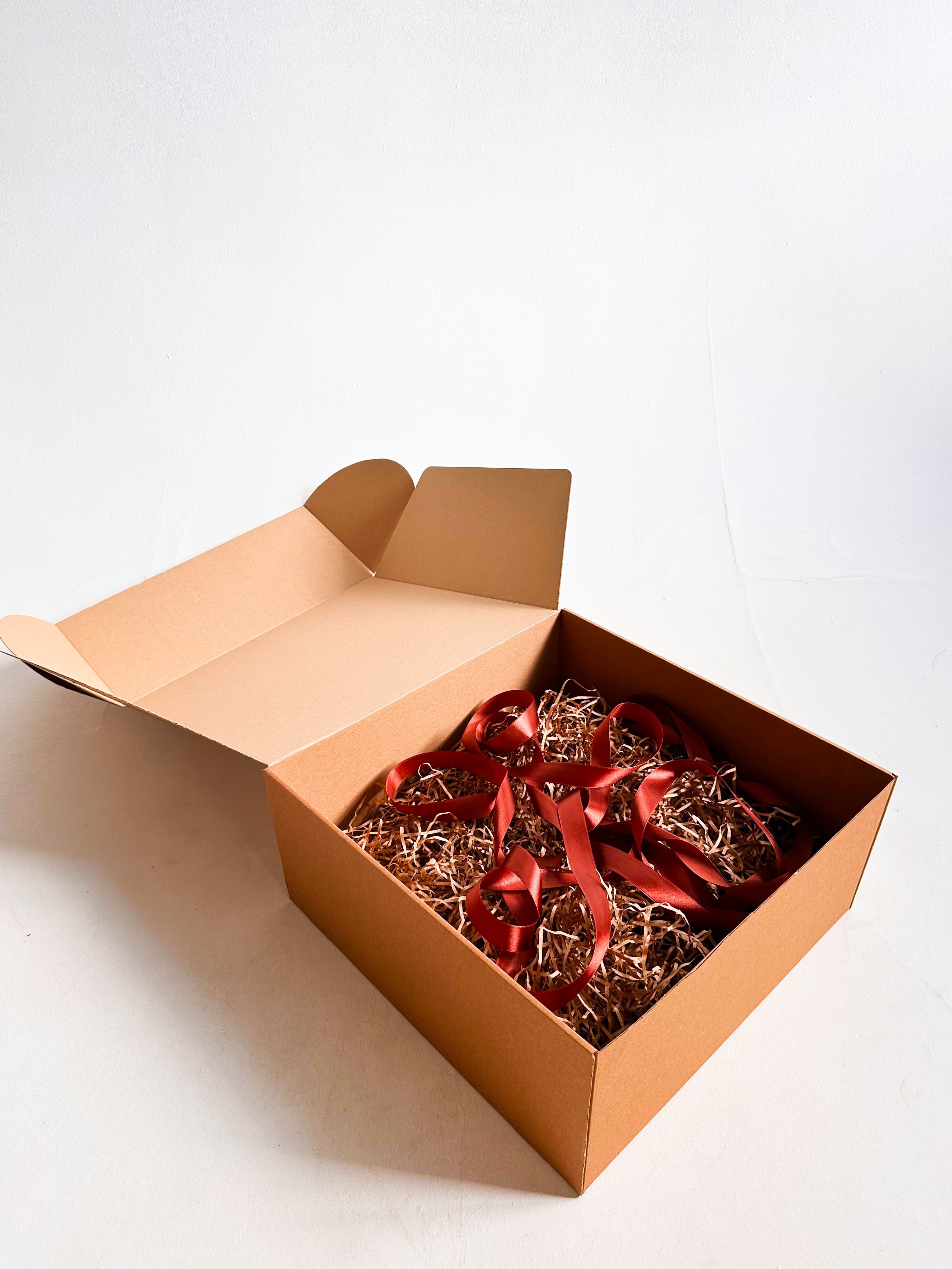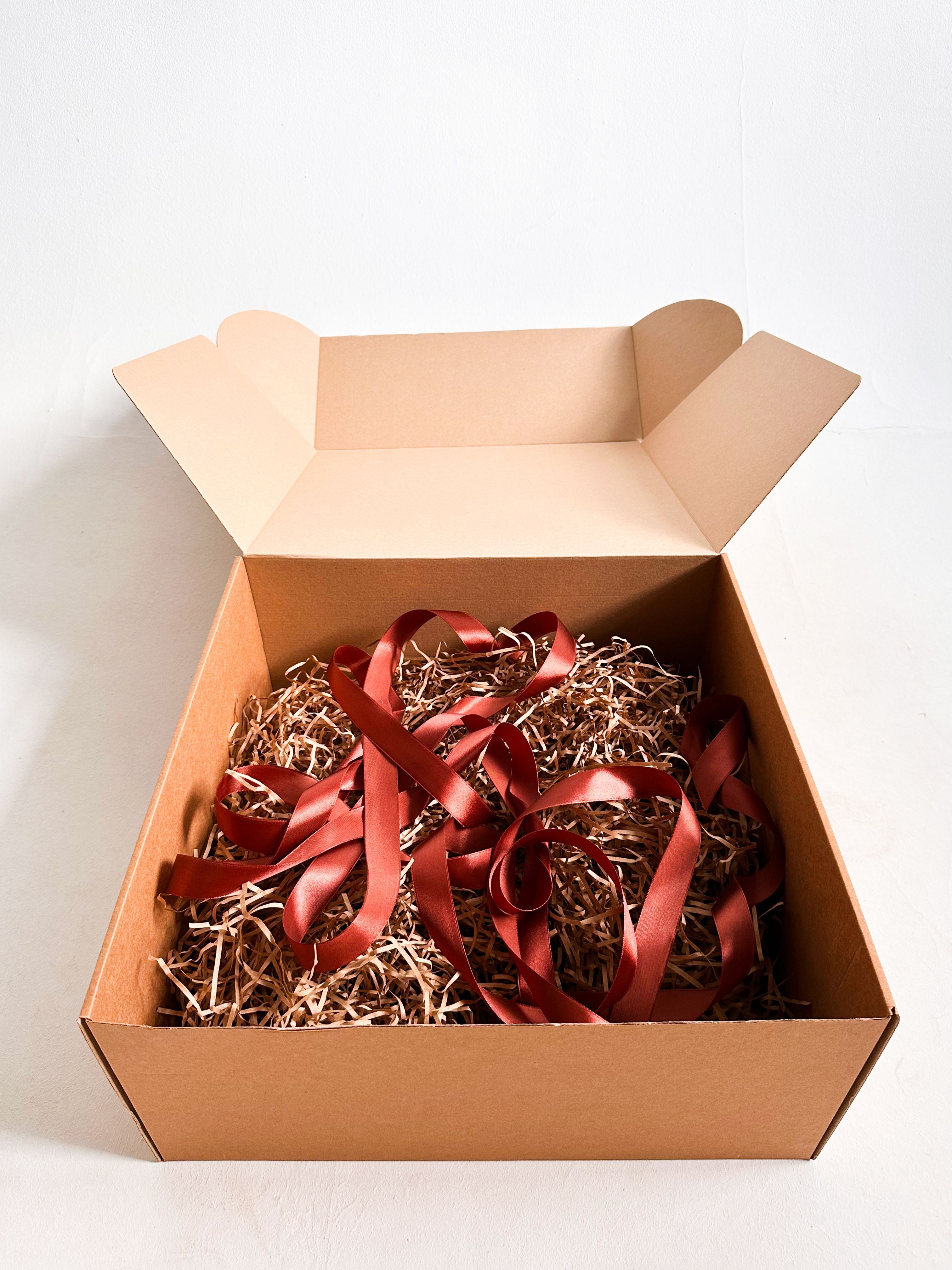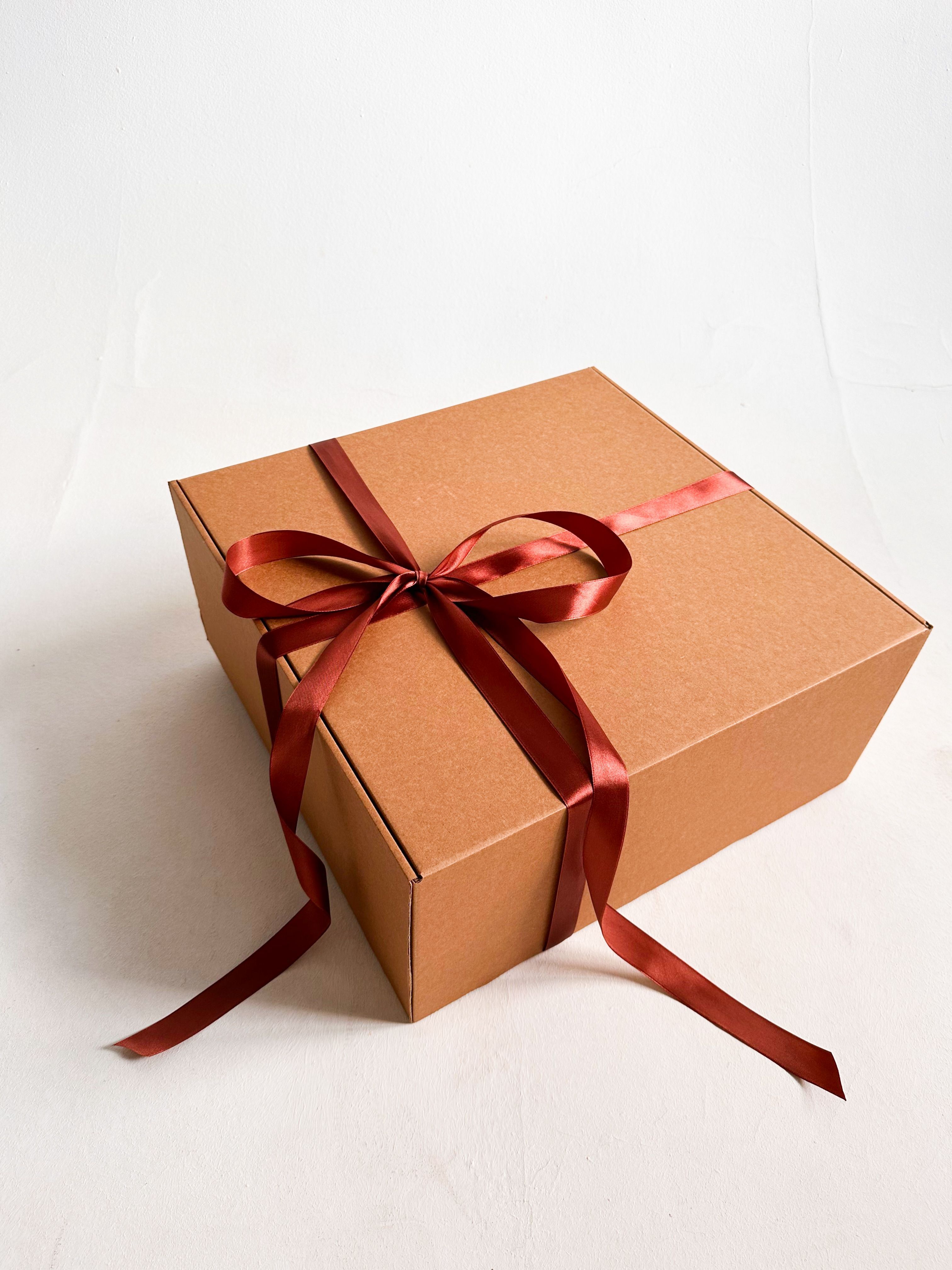 Крафтовая текстура коробки подчеркивает её экологичность и лаконичный стиль, а надежная конструкция с откидывающейся крышкой делает процесс упаковки и вручения удобным и эффектным. Коричневая атласная лента, напоминающая оттенок спелого каштана или древесной коры, добавляет упаковке теплоты и сдержанной роскоши. Такой акцент идеально сочетается с натуральными материалами, создавая баланс между естественностью и праздничным настроением.