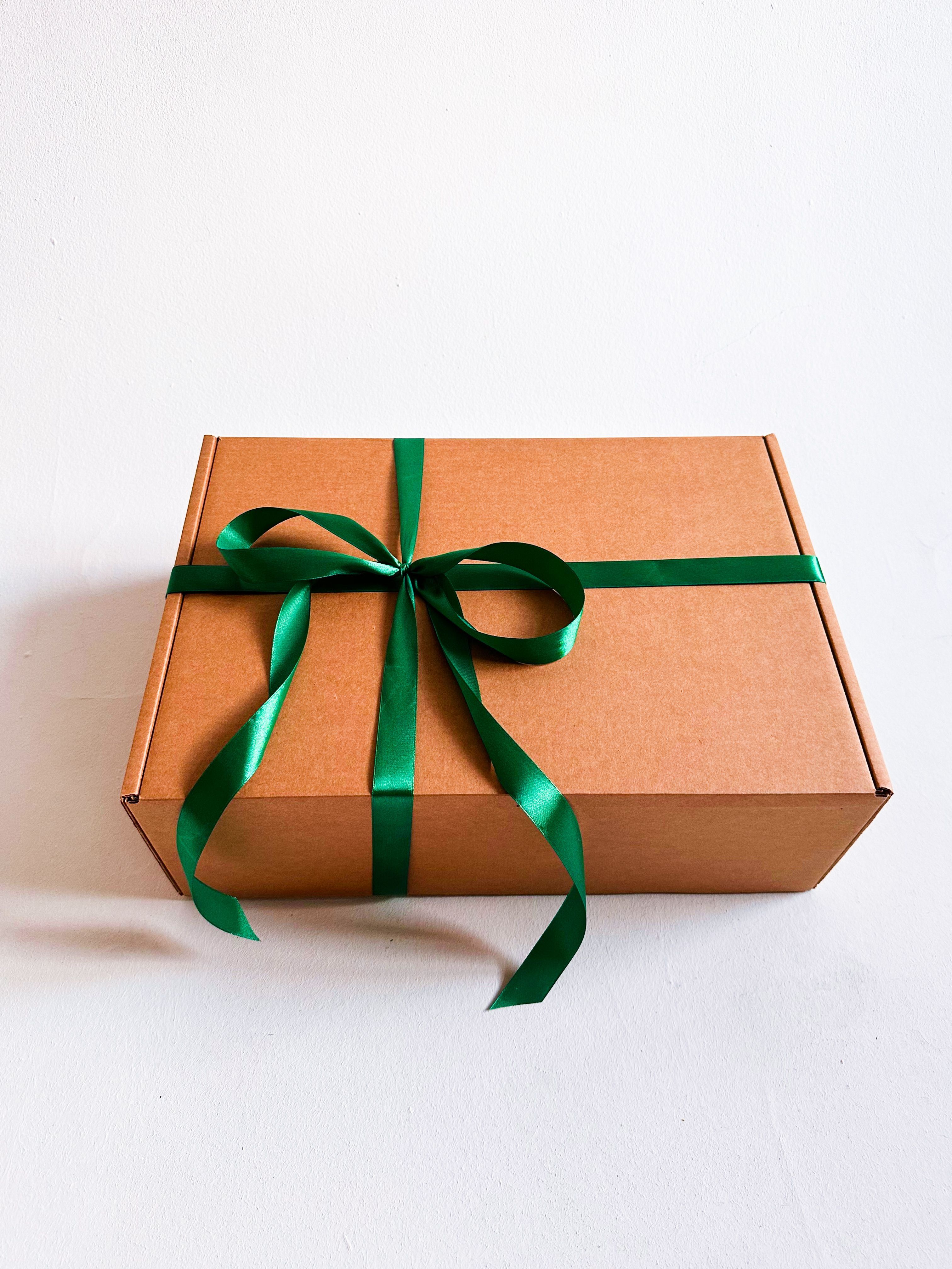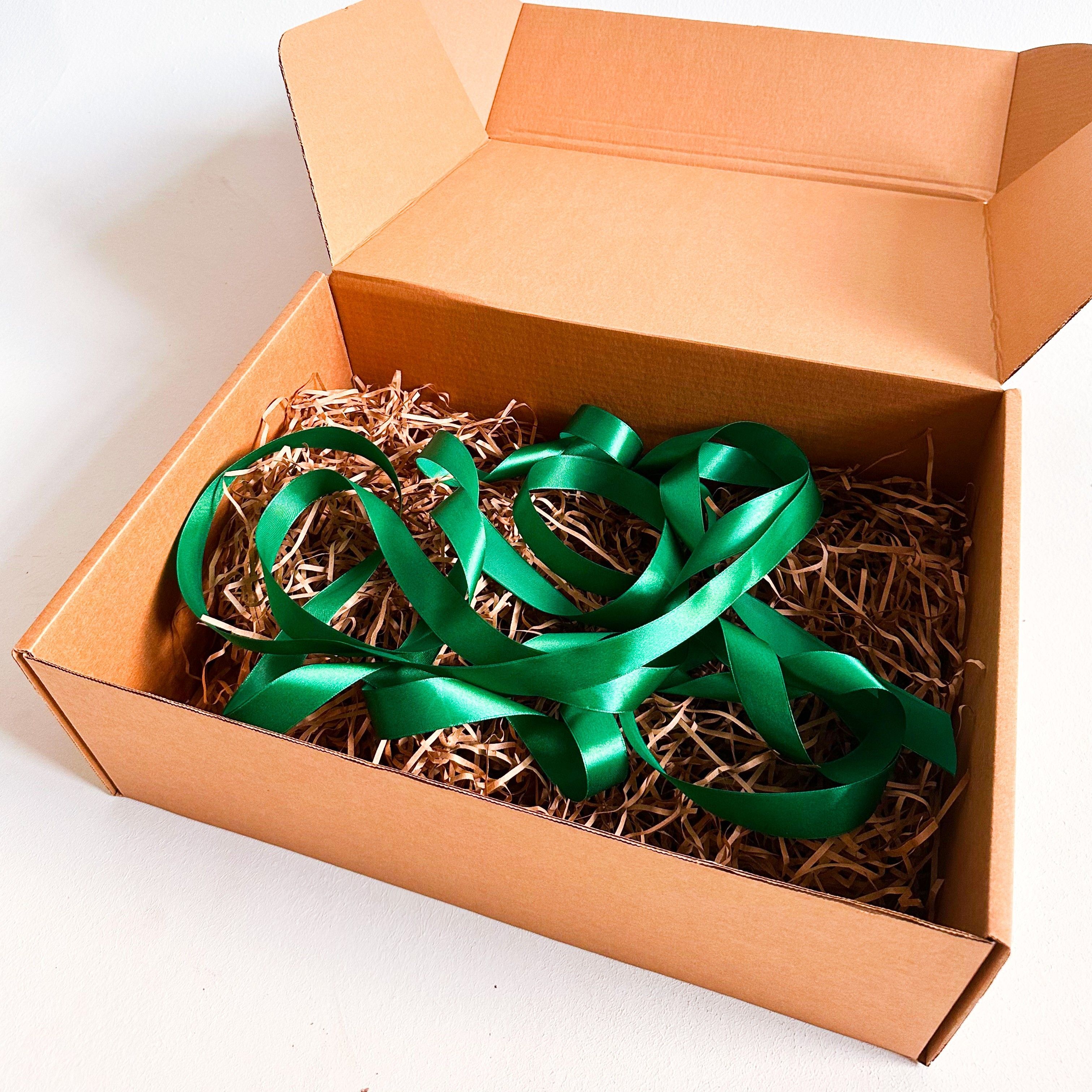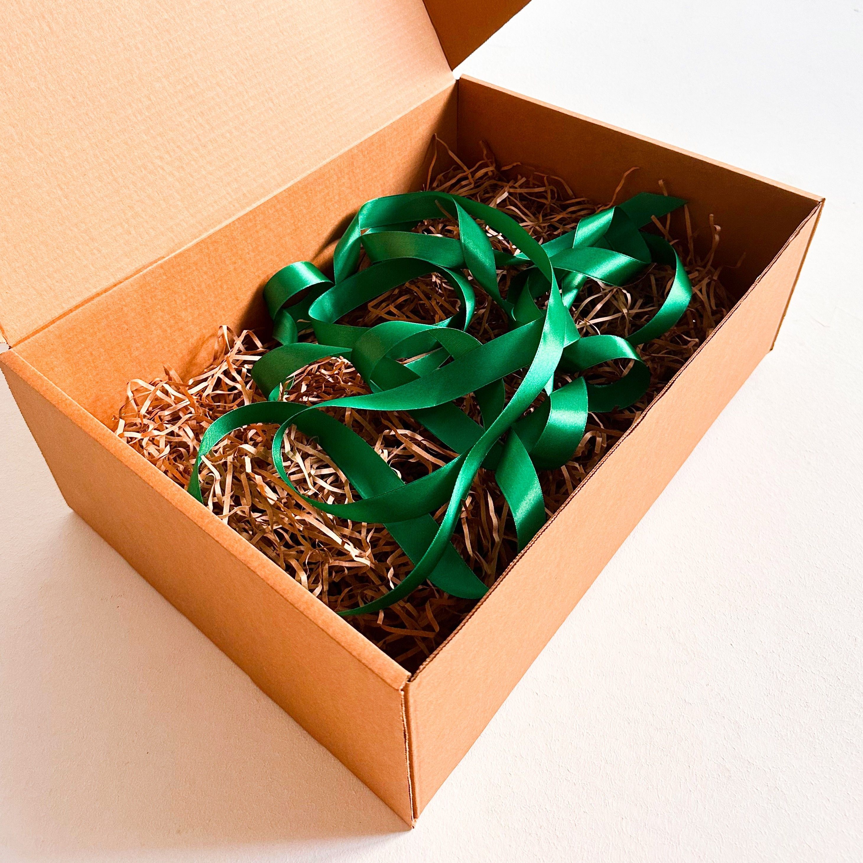 Большая подарочная коробка GILEV 44x32x15см с зеленой лентой и наполнителем крафт