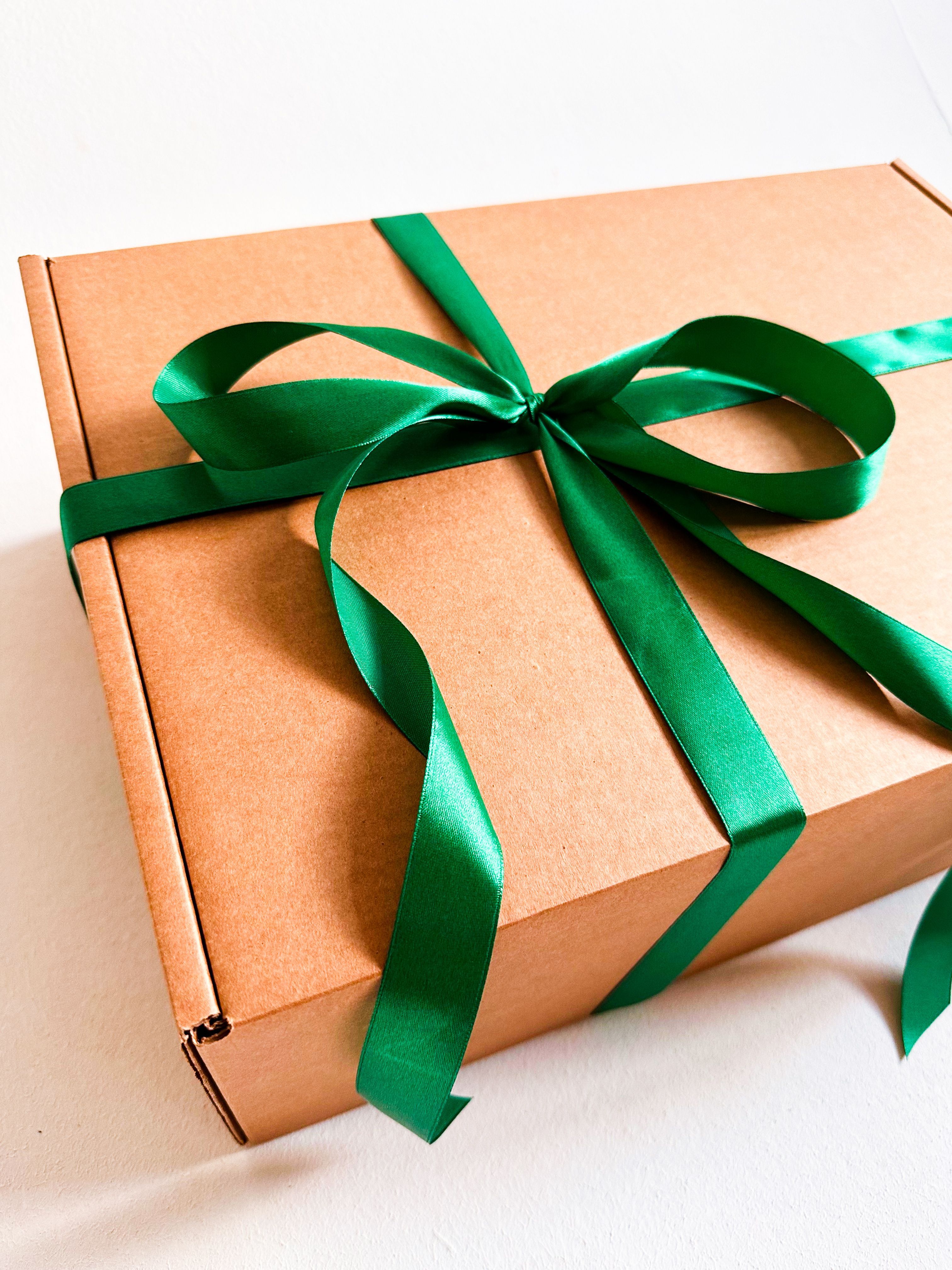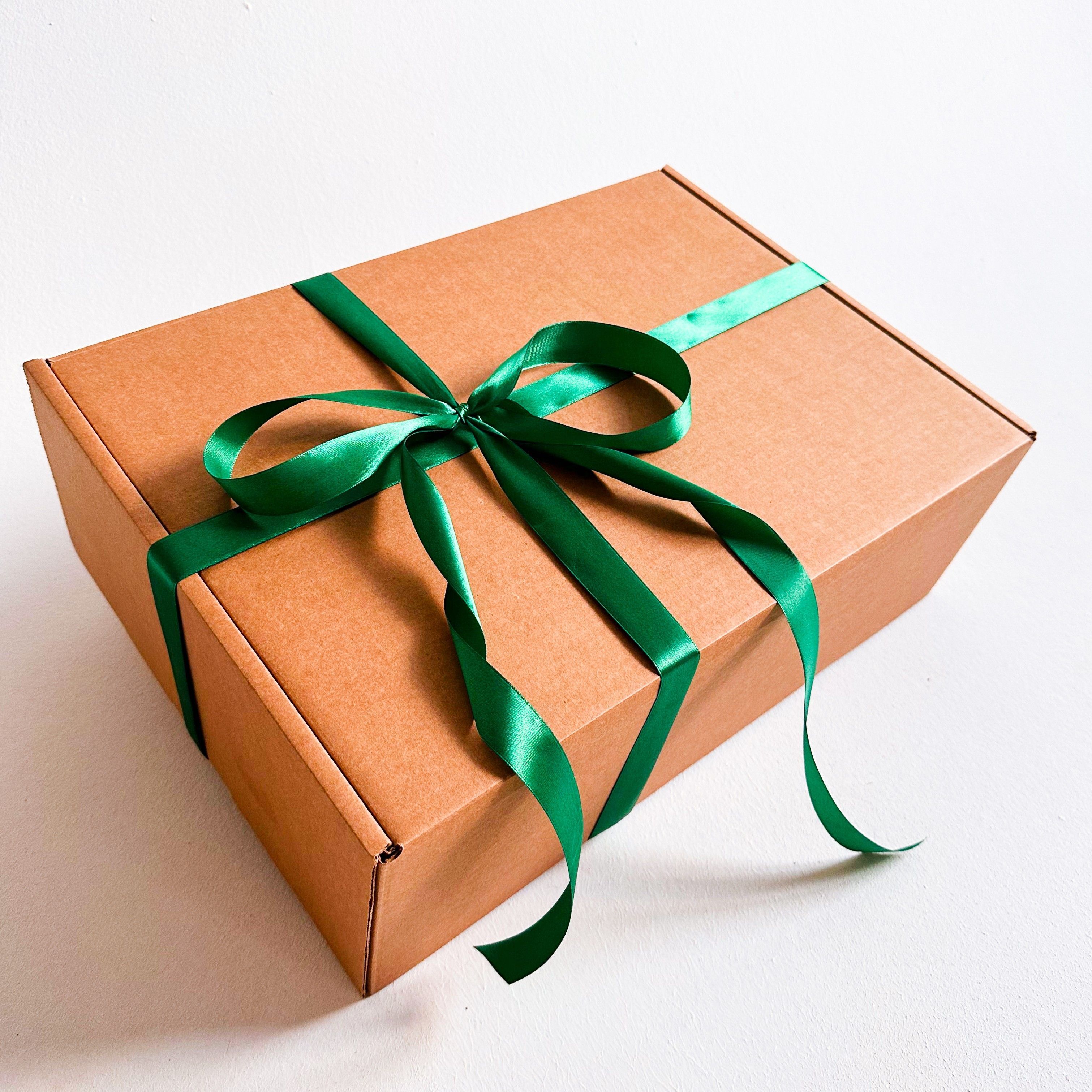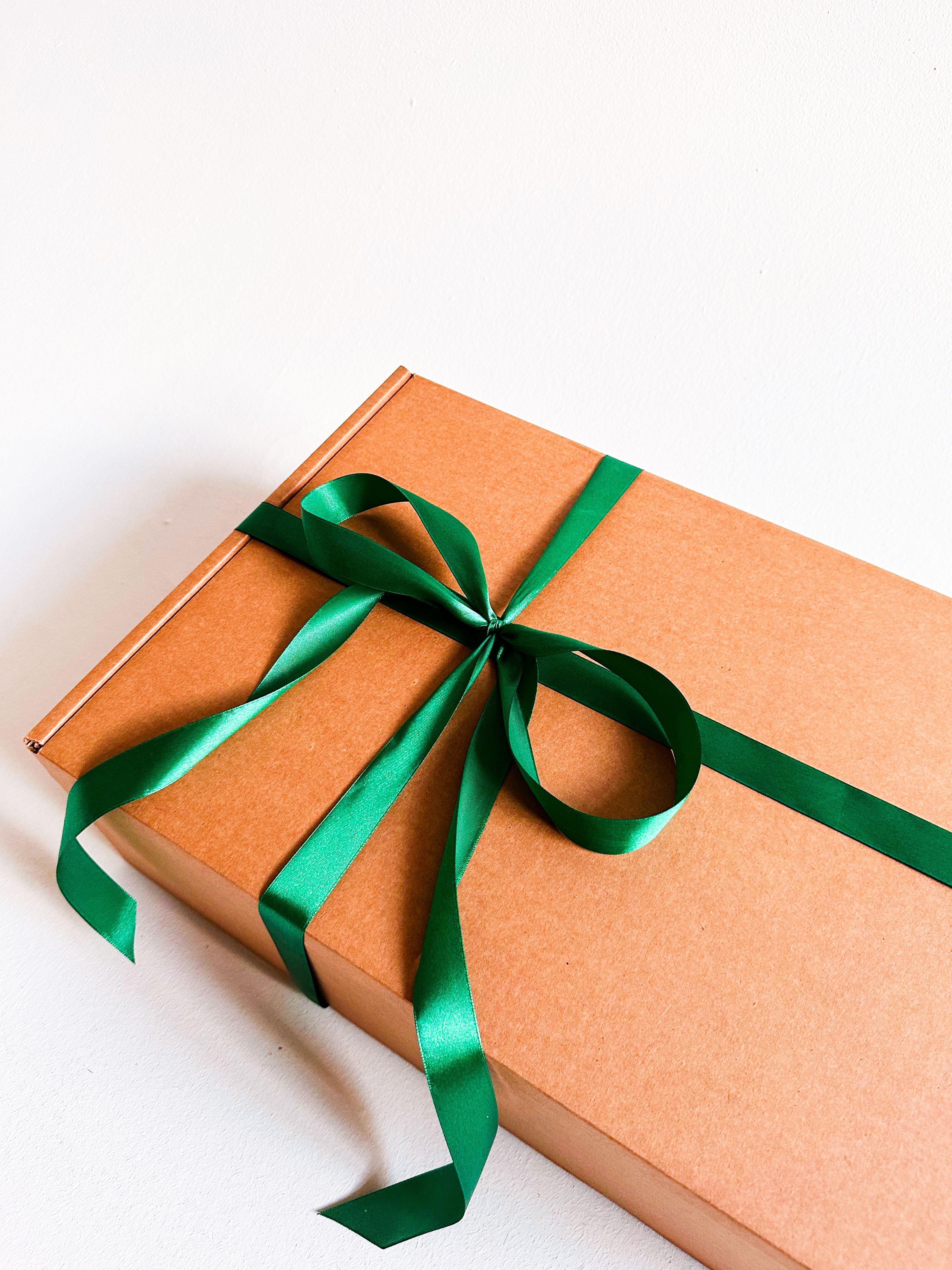 Большая подарочная коробка GILEV 44x32x15см с зеленой лентой и наполнителем крафт