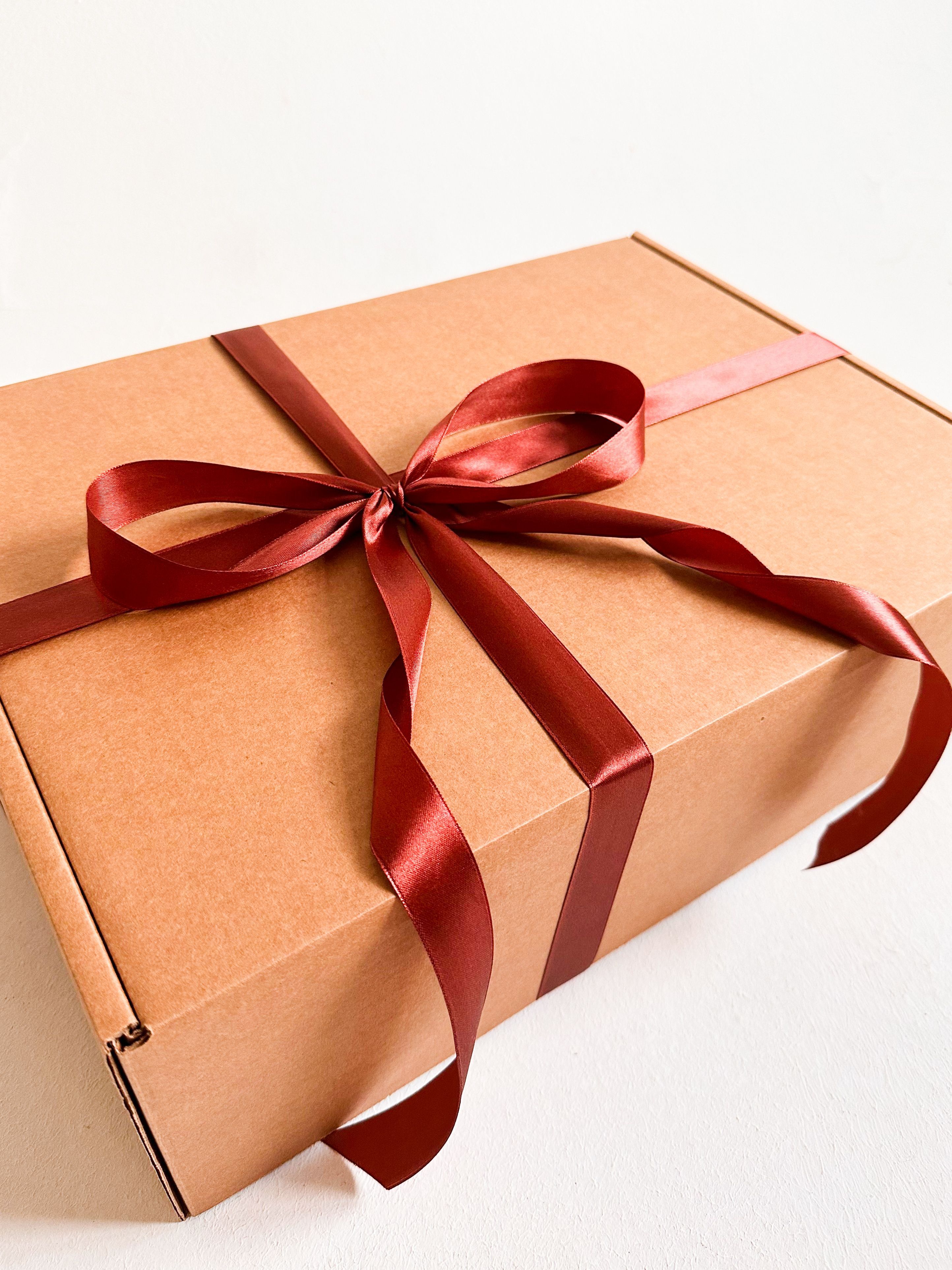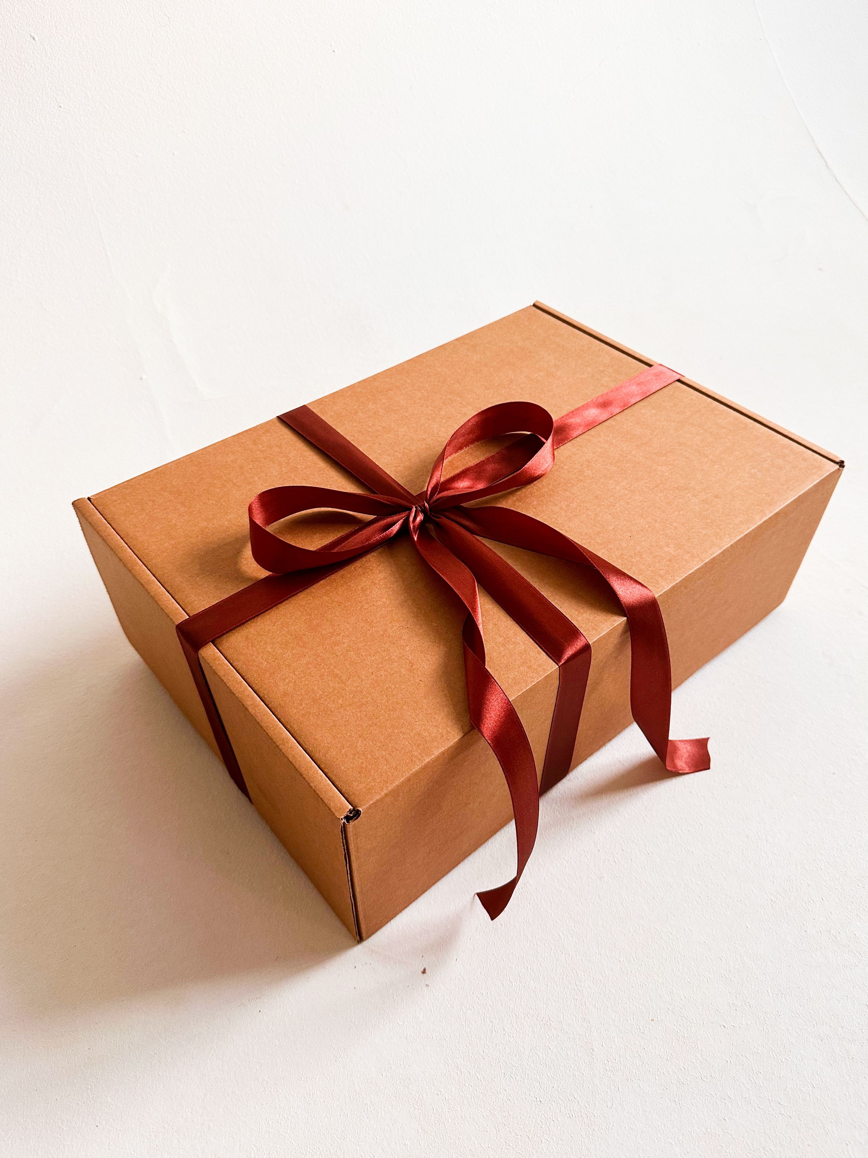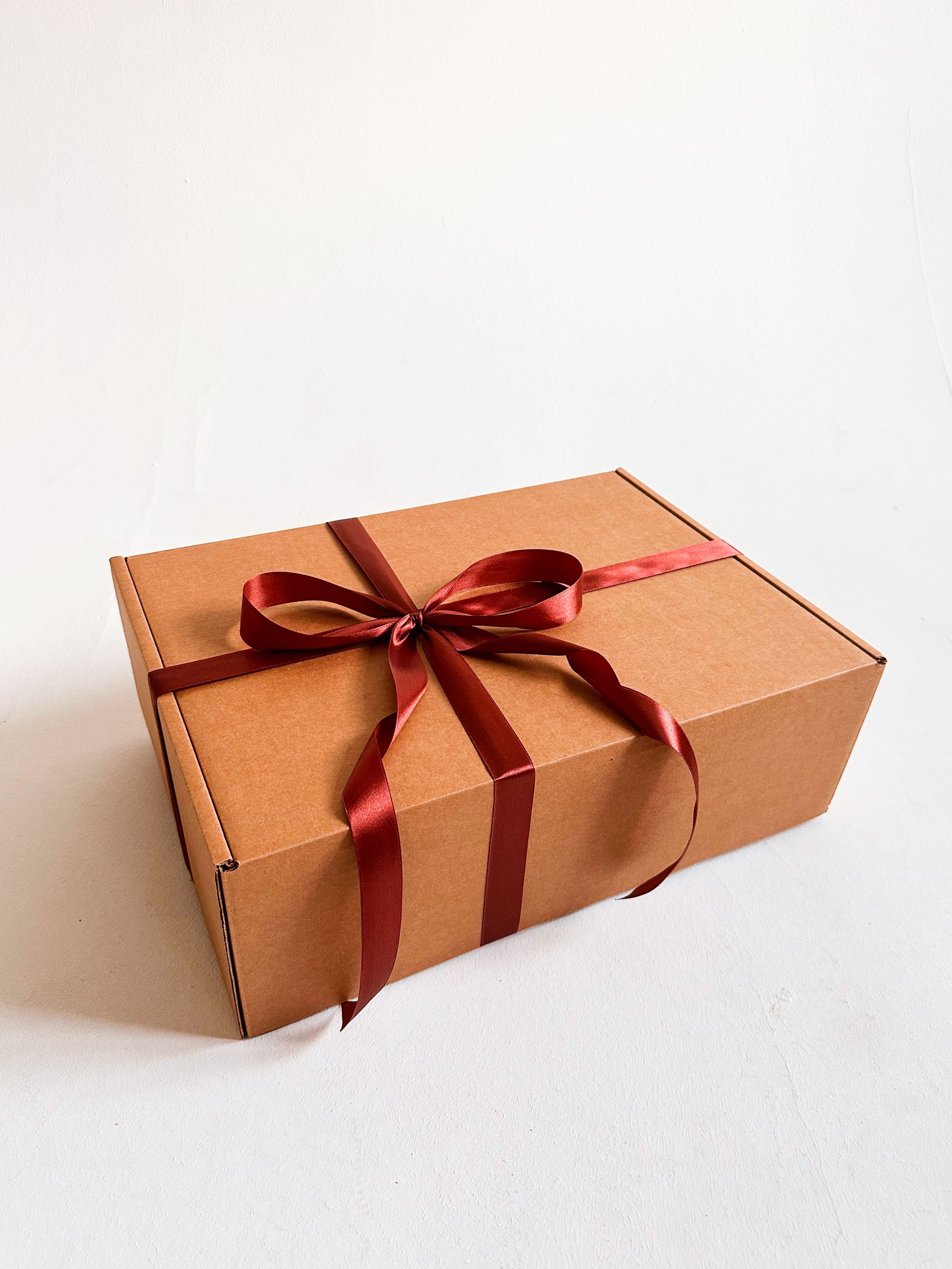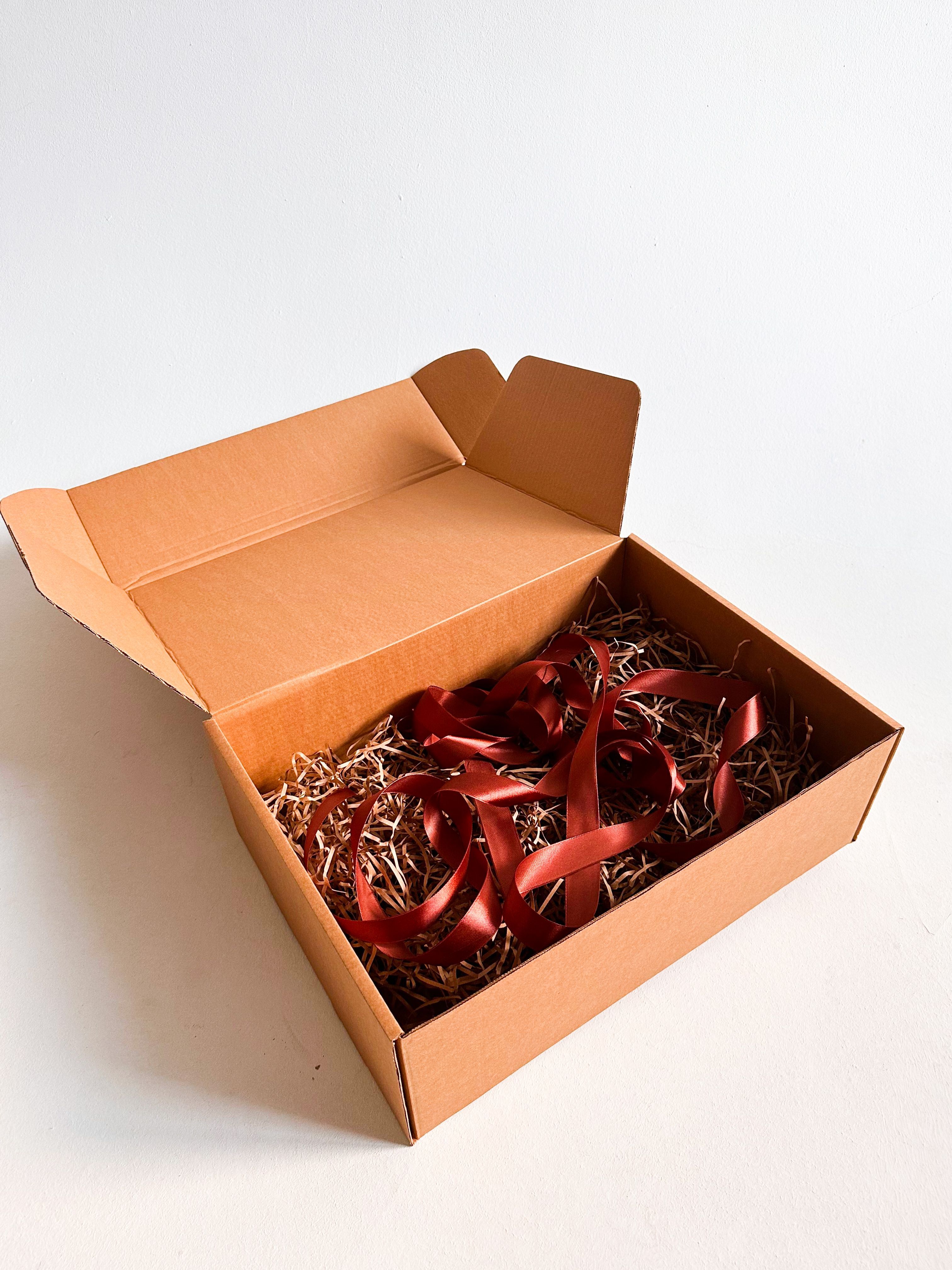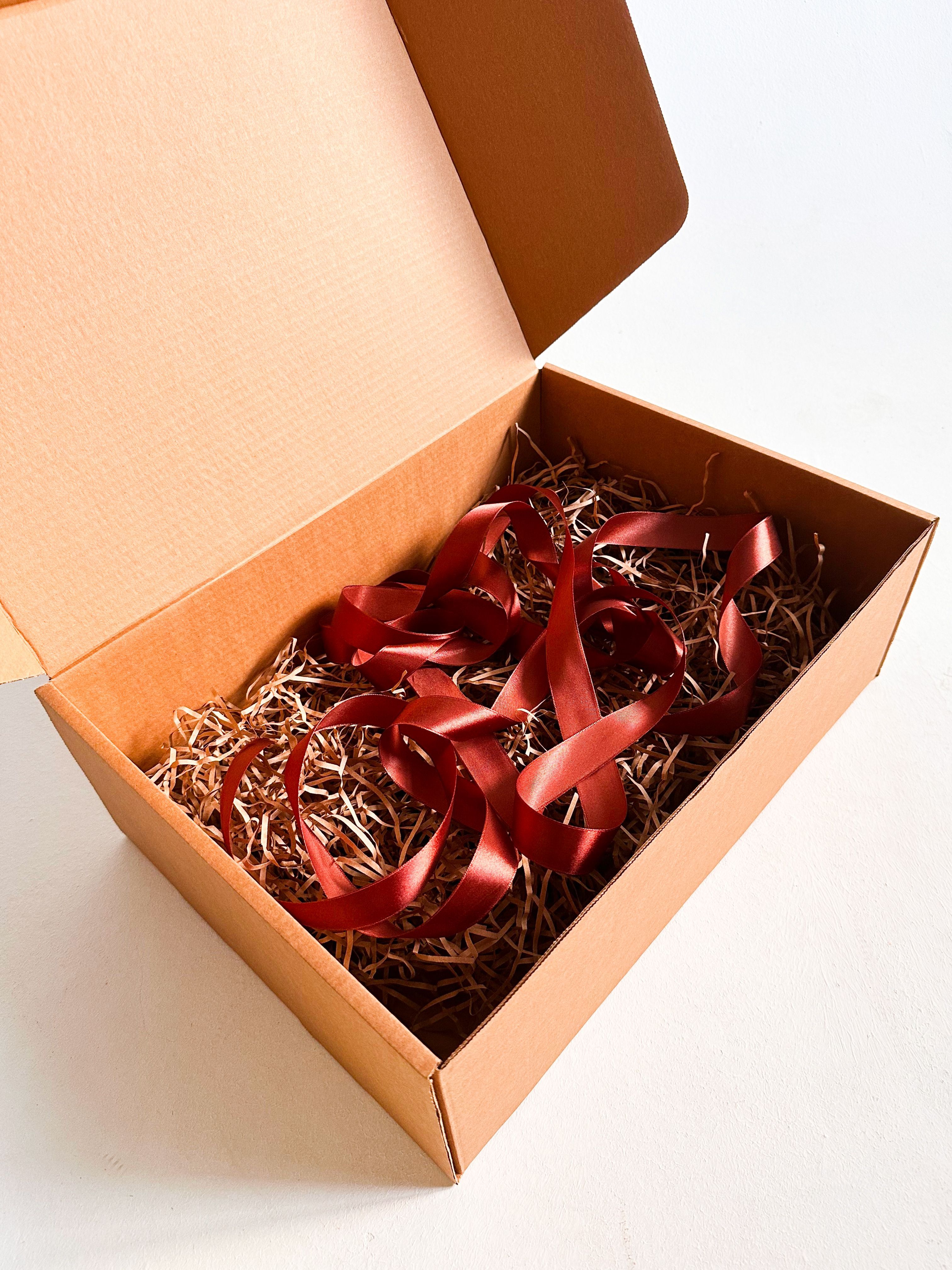 Большая подарочная коробка GILEV 44x32x15см с коричневой лентой и наполнителем крафт