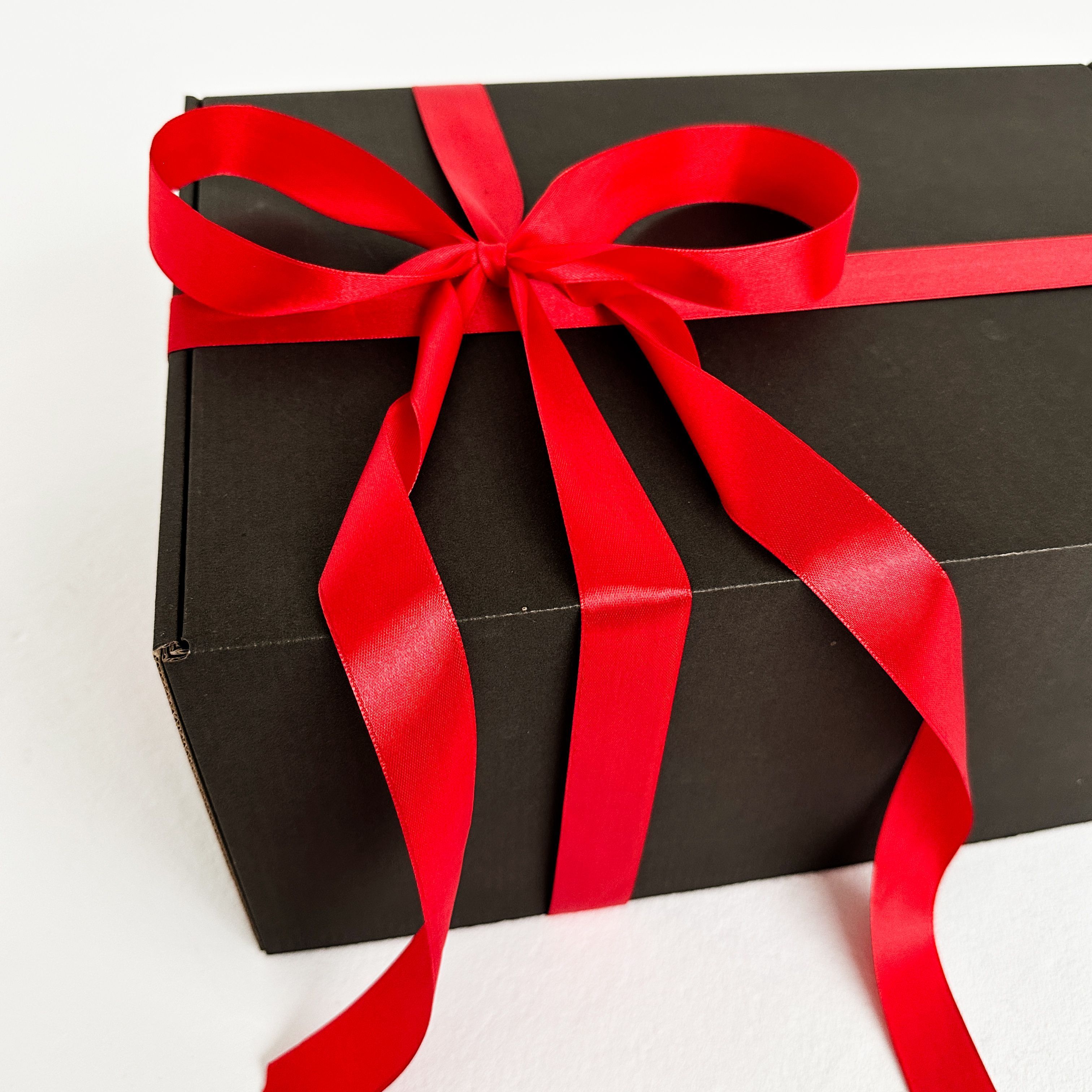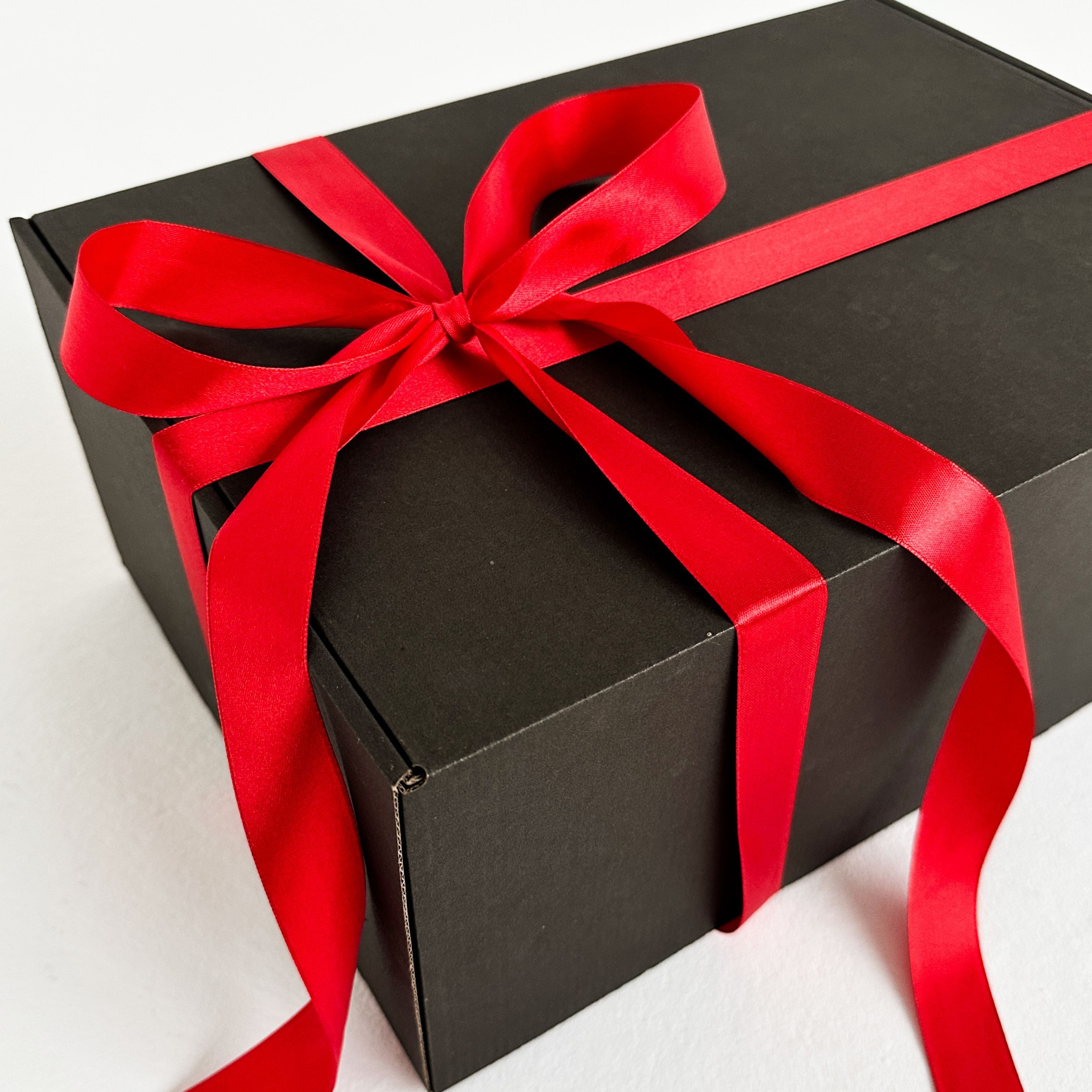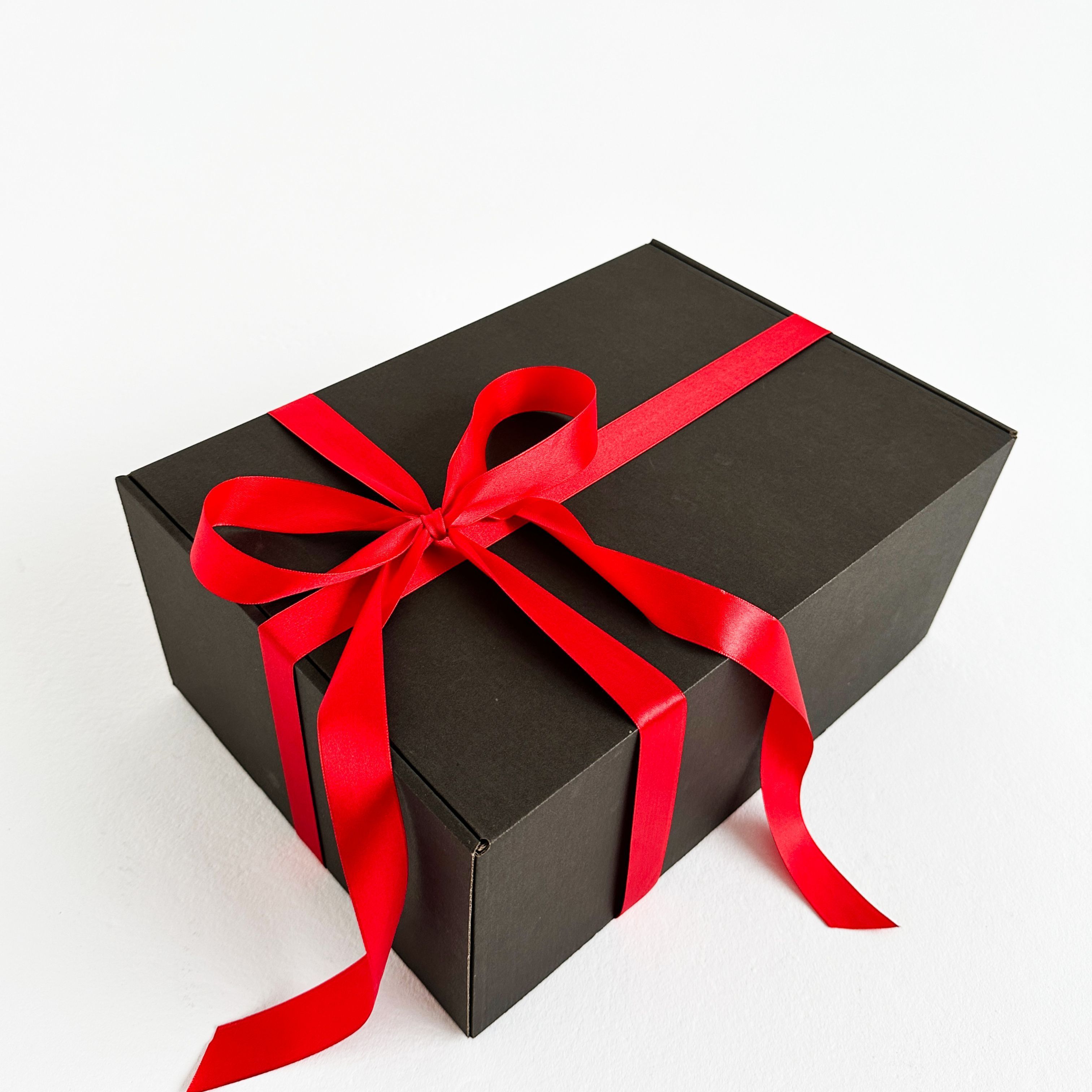 Роскошная черная подарочная коробка 37×26×12 см с бумажным наполнителем и красной атласной лентой – готовое решение для стильной упаковки подарков
