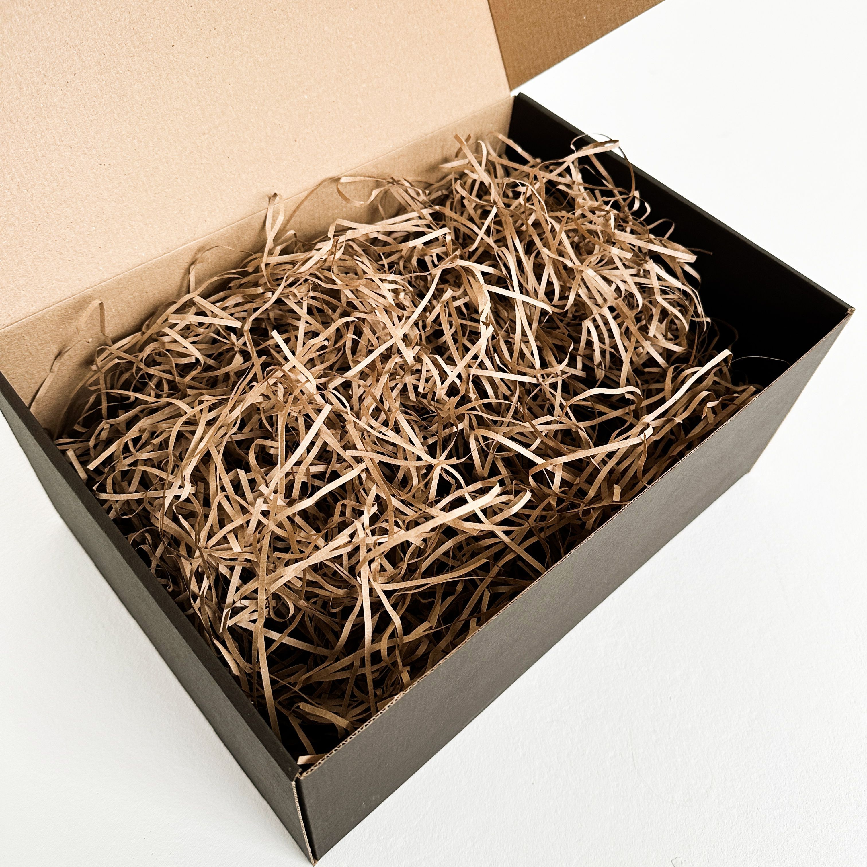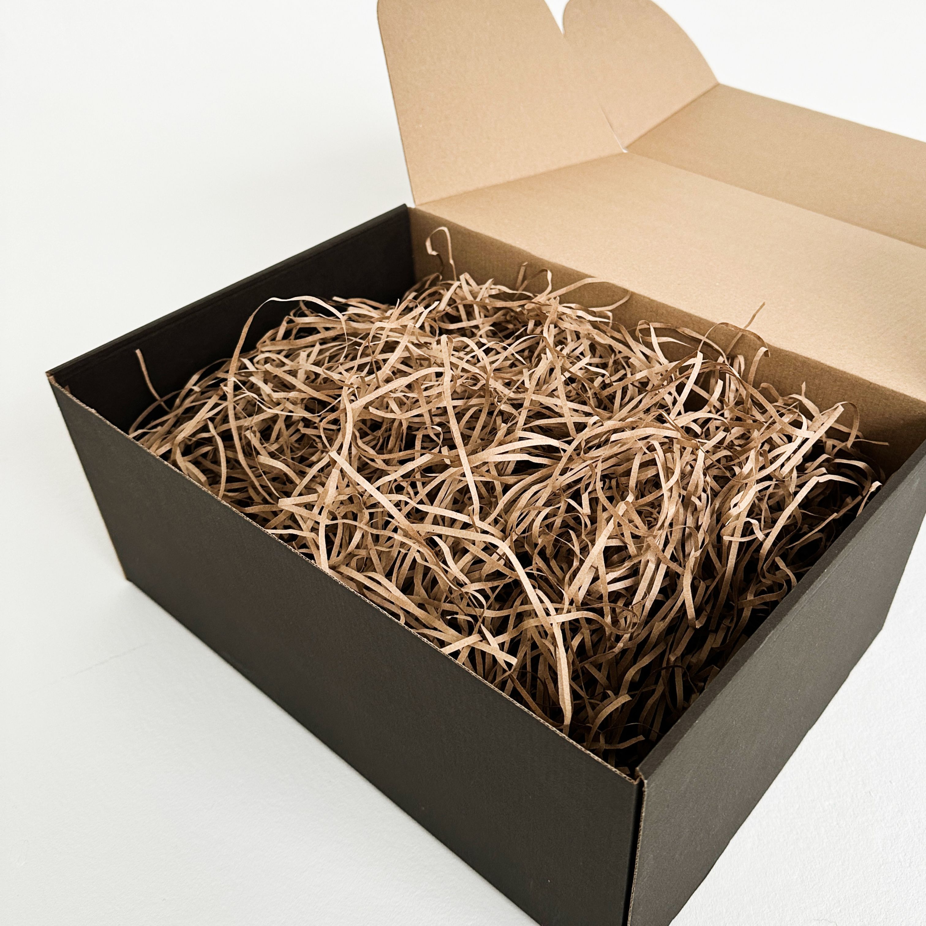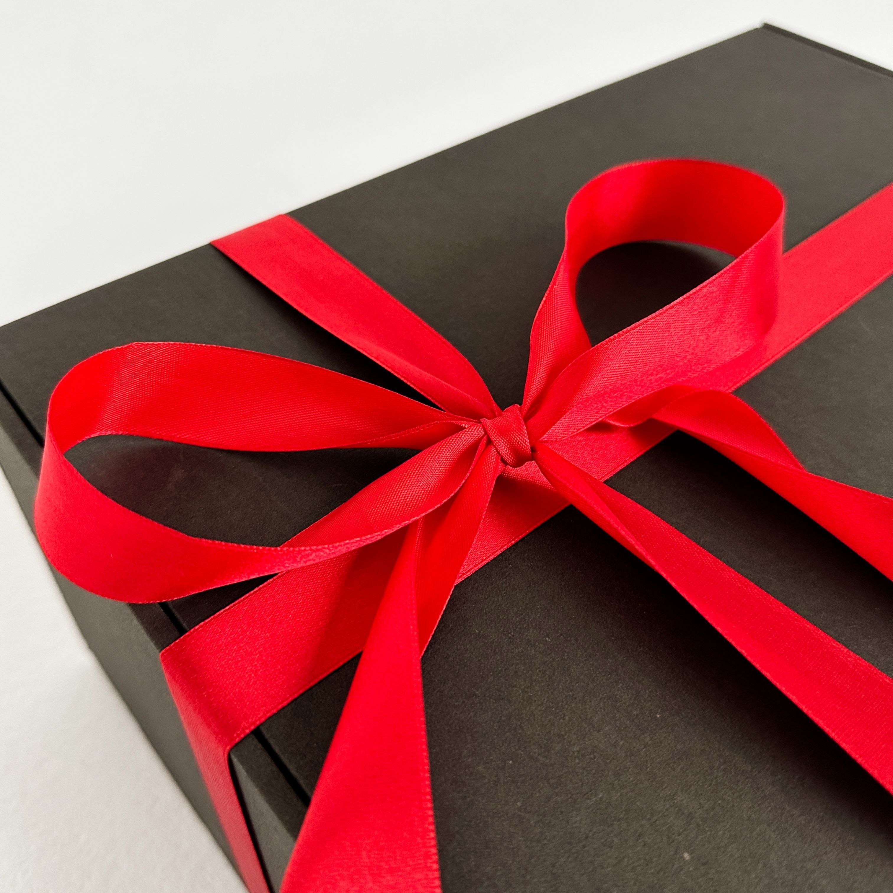 Роскошная черная подарочная коробка 37×26×12 см с бумажным наполнителем и красной атласной лентой – готовое решение для стильной упаковки подарков