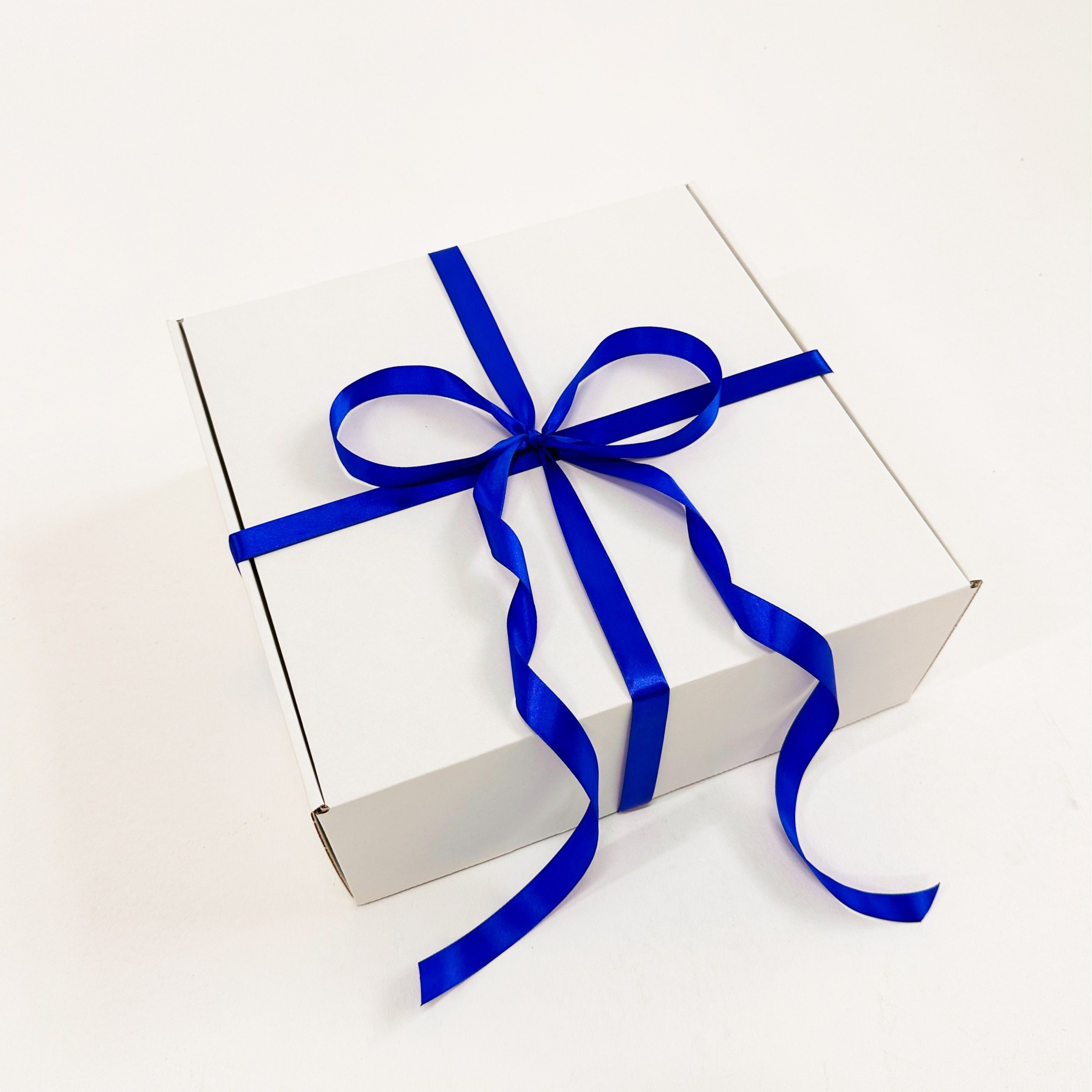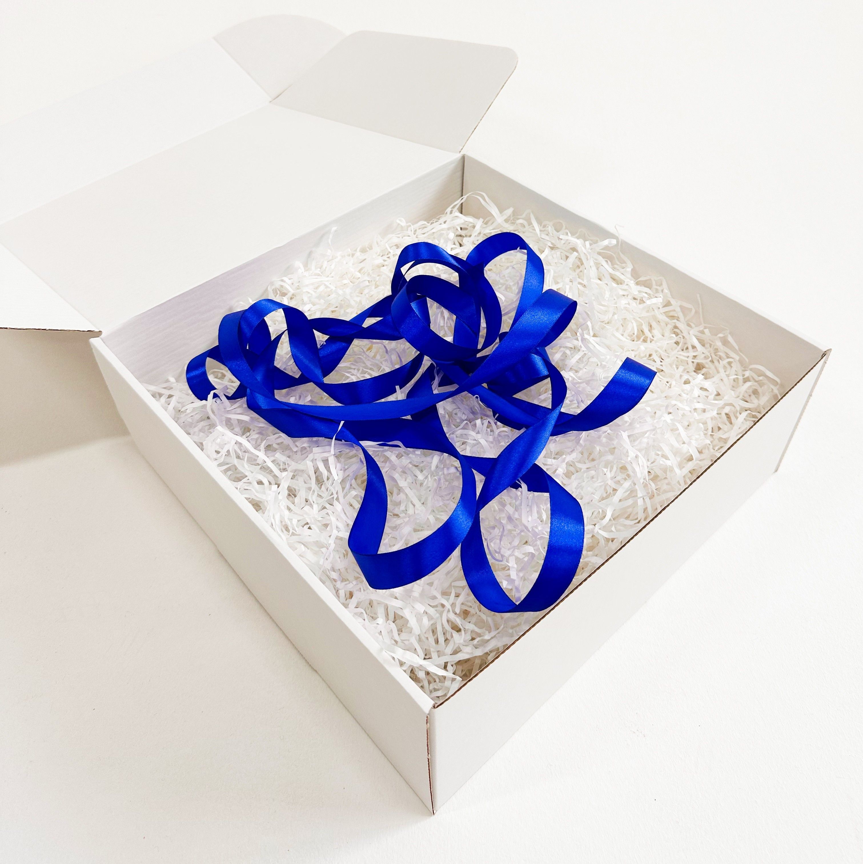 Главная изюминка этой упаковки - синяя атласная лента, которая нежно обвивает коробку, придая ей шарма и роскоши. Использование синего цвета в сочетании с белым создает эффектный контраст, который привлекает внимание и подчеркивает особый характер подарка. Красота этой ленты раскрывается, когда она элегантно завязывается в изящный бант на широких белых узлах, добавляя упаковке изысканности и эстетического очарования.