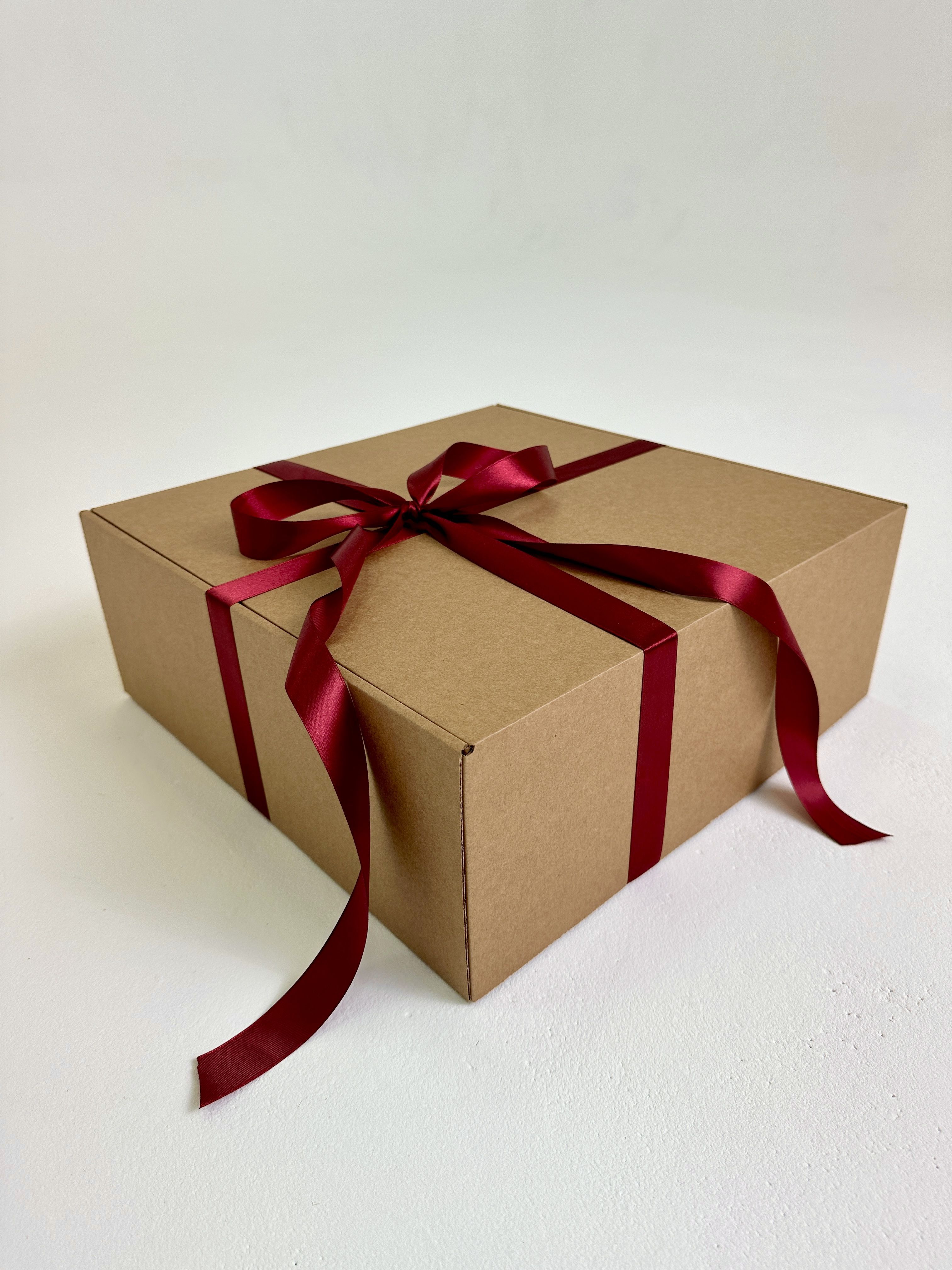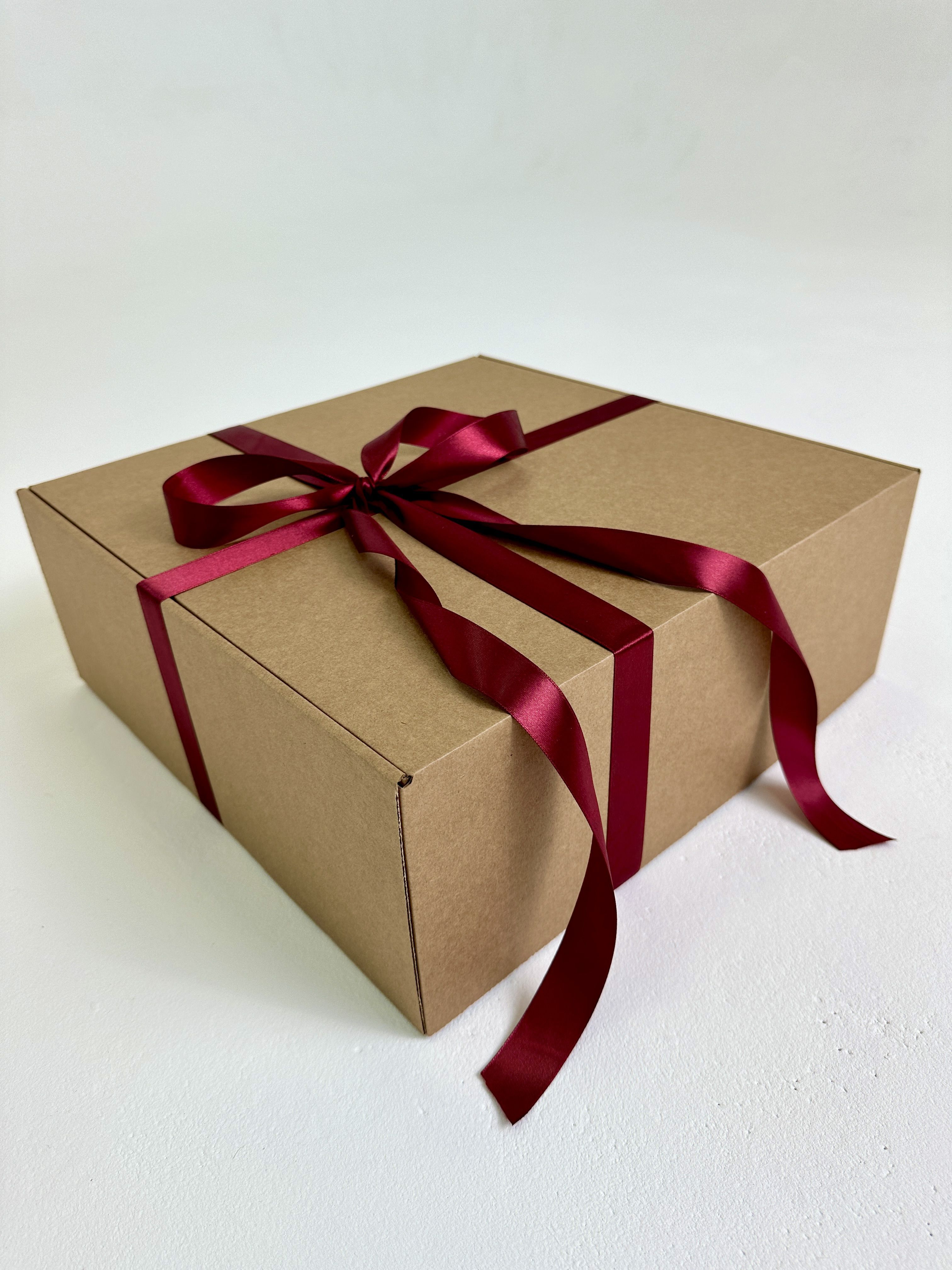 Большая подарочная коробка GILEV 37x37x14 см с бордовой лентой и наполнителем крафт