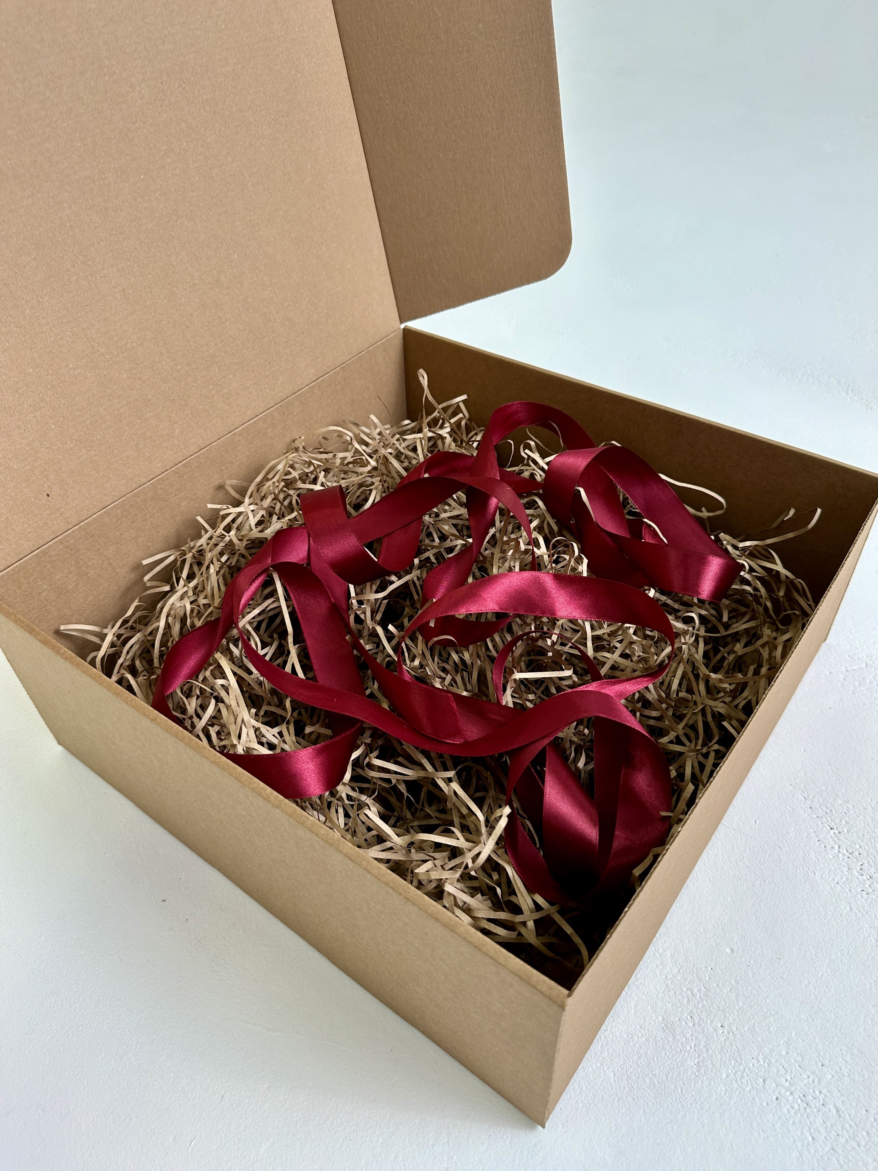 Это уже готовая упаковка для подарка, ведь в комплекте идут экологичный бумажный наполнитель крафт и роскошная лента насыщенного бордового оттенка. Вам не придется тратить время на поиск дополнительных аксессуаров — просто разместите подарок внутри, дополните его мягким крафтовым наполнителем для эффекта «вау» и завяжите ленту изящным бантом. Такая подарочная коробка с наполнителем станет отличным выбором для любого праздника: будь то день рождения, 23 февраля, 8 марта, Новый год, 14 февраля или другое торжество.